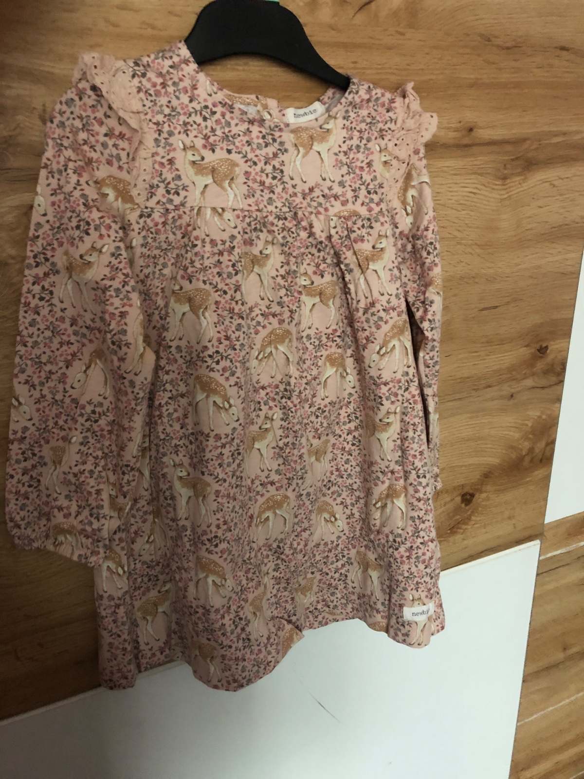 Krásne šaty so srnkami, rada premeriam, majú malú dierku, nafotená, nevidno pri nosení 🩷🦌