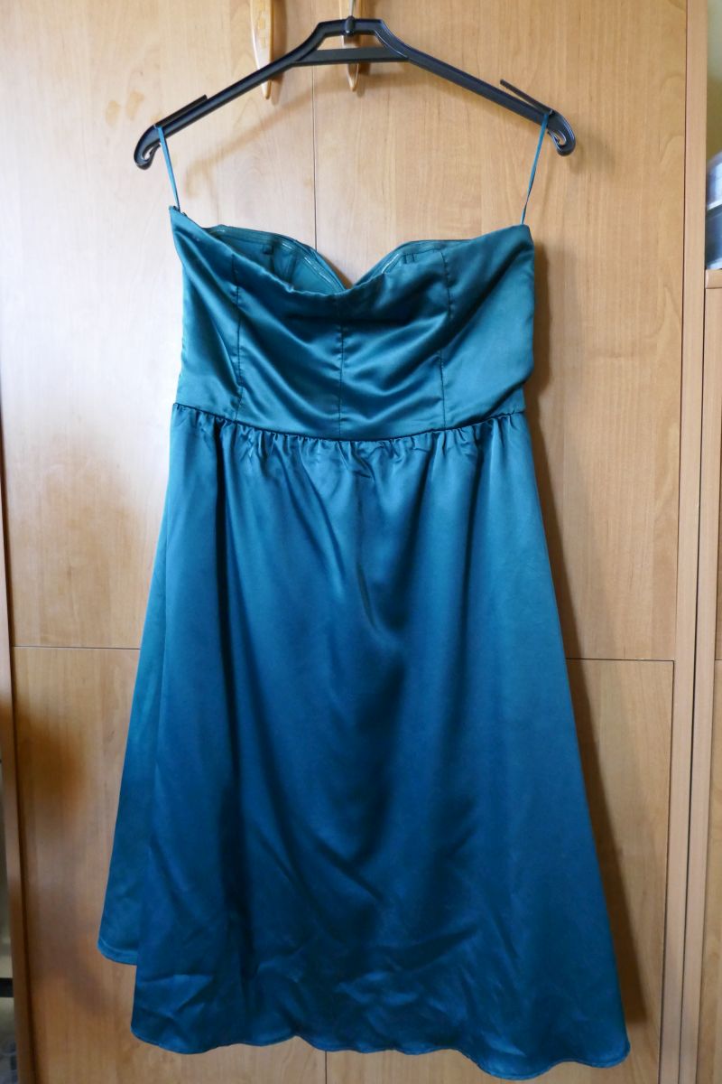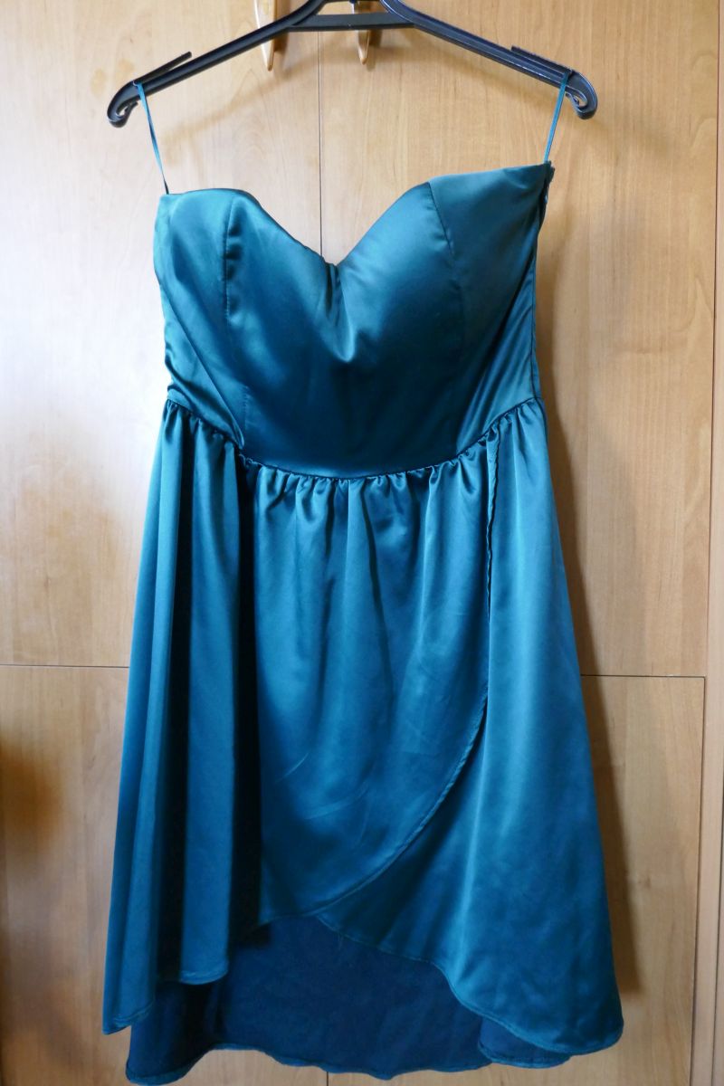 Saténové šaty tmavozelené, bez ramienok. Oblečené asi dvakrát. Na prsiach vypchávky, na boku zips. Vnútri okolo pŕs silikón (guma) proti zošmyknutiu.