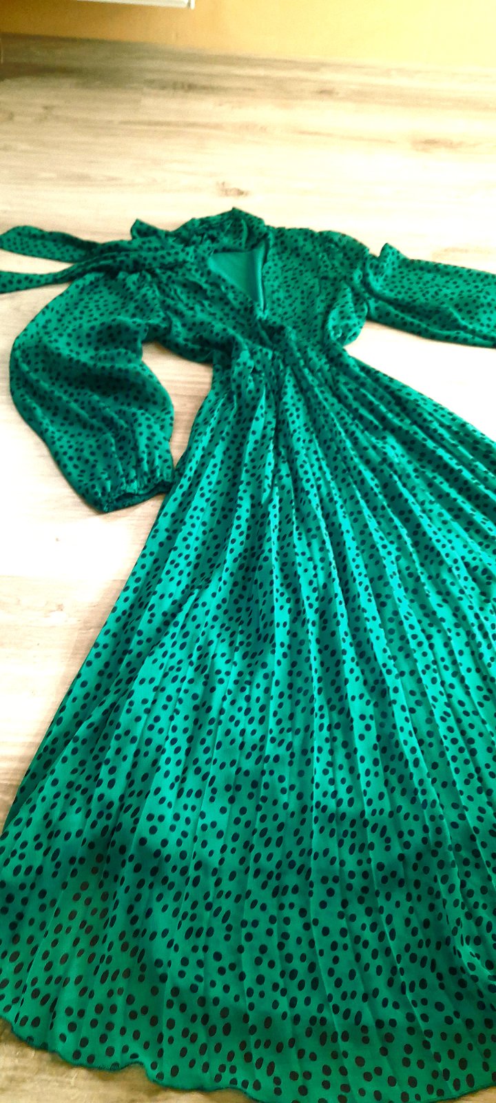 Podšité plisovane šaty, krásne detaily, s mašľou okolo krku, bohaté puff rukávy, široká sukňa. Neprehliadnutelne