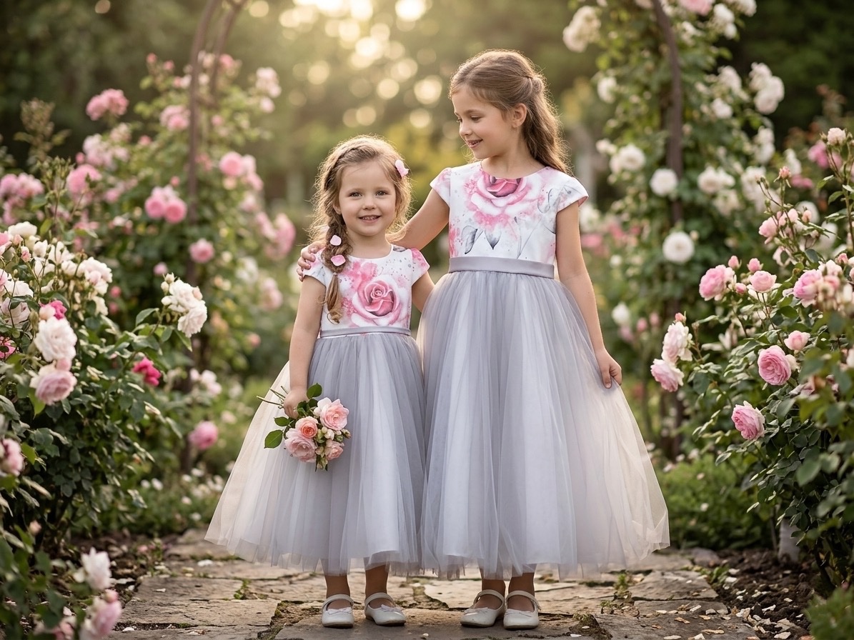 SkladomDetské tylové šaty pre dievčatká s bohatou, honosnou sukňou. Vrch je biely s jemným vzorom ružových kvetov, ktorý pôsobí nežne a elegantne. Vpredu sa nachádza jemný opasok, ktorý sa vzadu viaže do mašle.