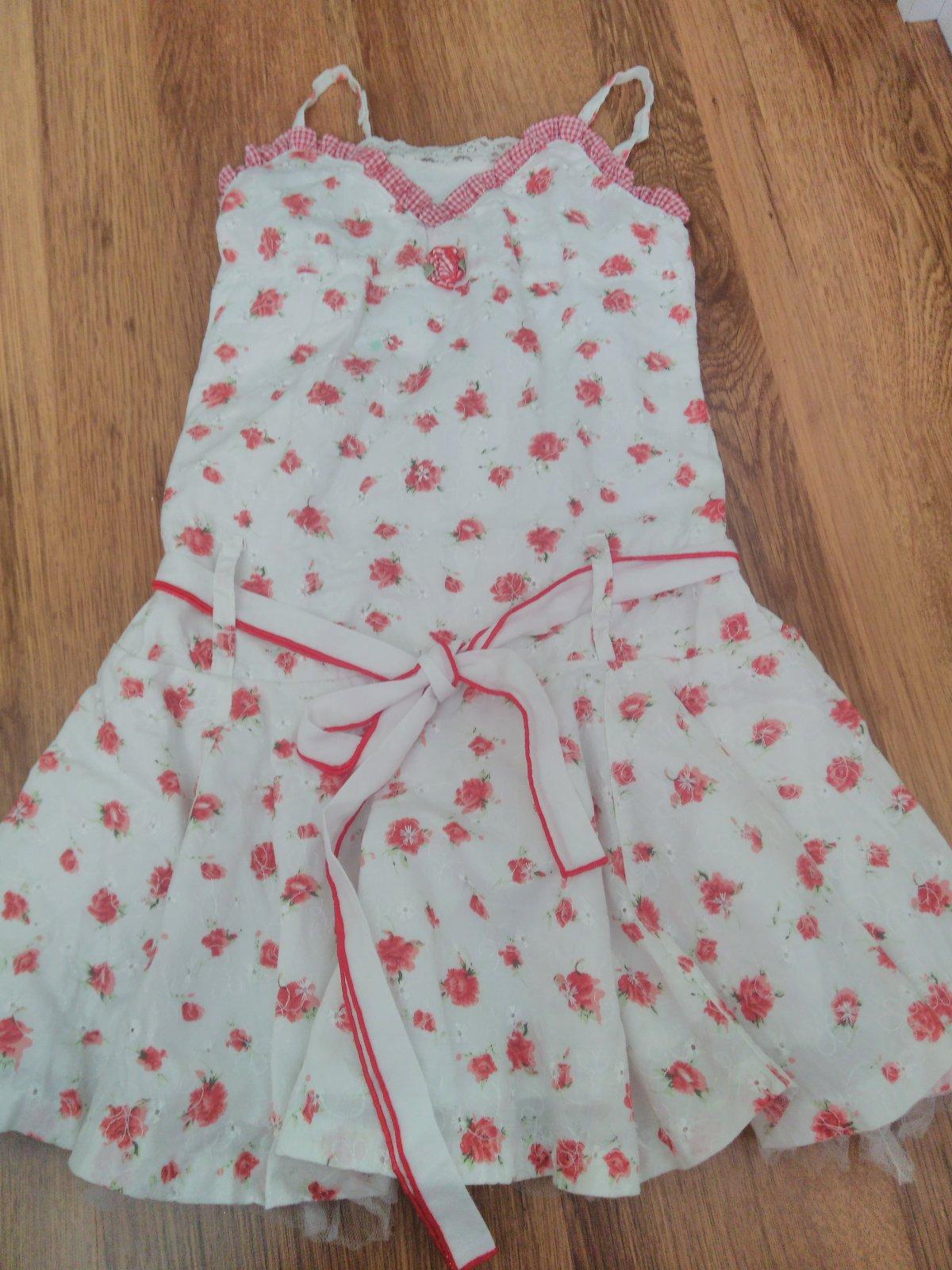 Nosené, bez poškodenia. Ľahké, vhodné aj na oslavu. Gombík vzadu, zips z boku. Veľ.128, dĺ. 70cm, š. 32cm.