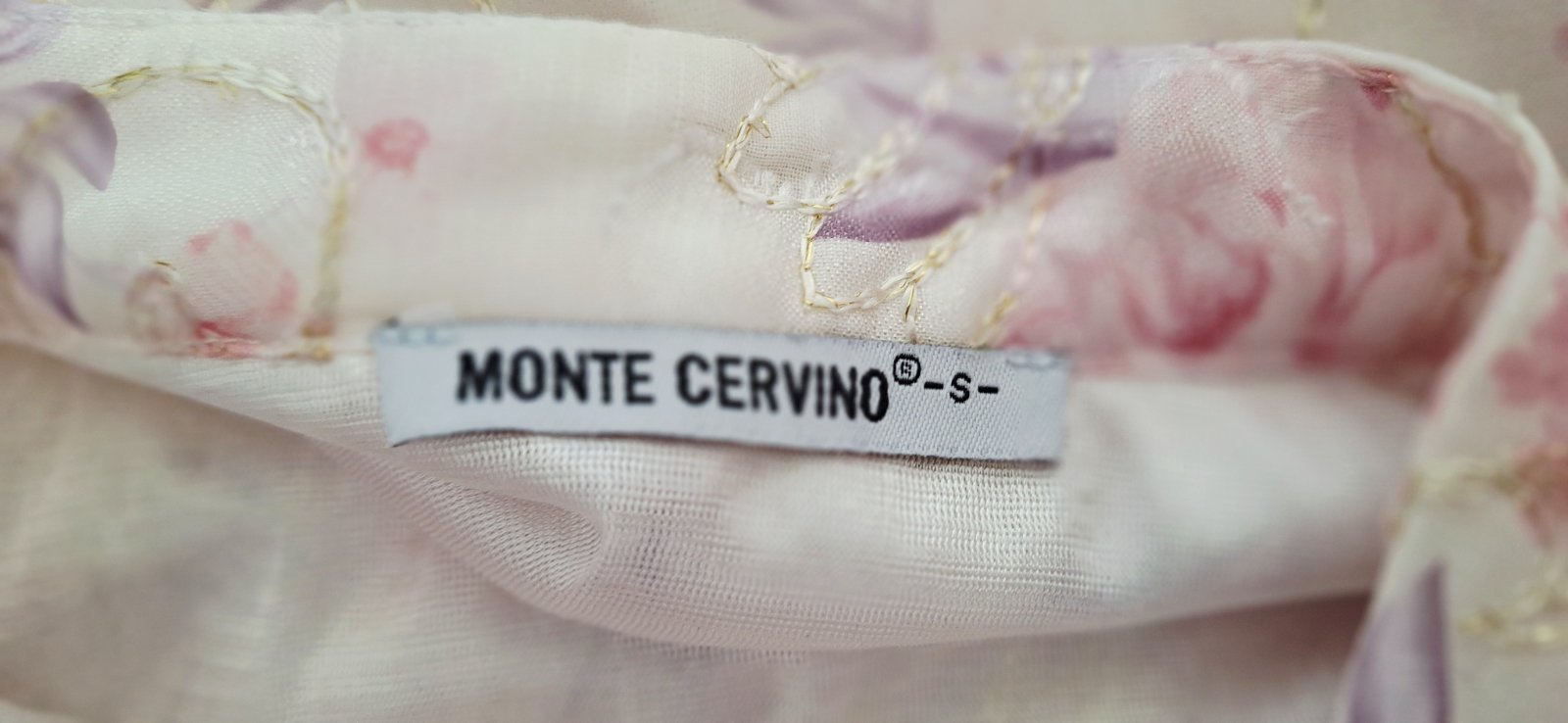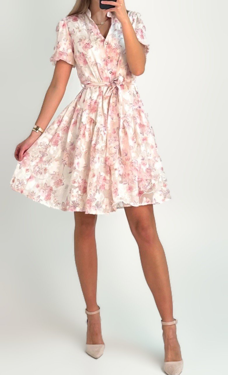 Jemné šaty v košeľovom štýle s kvetinovým printom a výšivkami so zlatou niťou, vhodné na spoločenskú príležitosť.