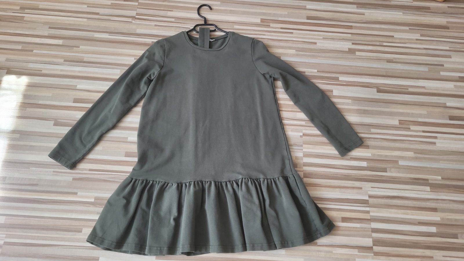 Upletove minisaty v khaki farbe. Na suknicke volan, vzadu maly V vystrih a zapinanie na 2 gombiky. Elasticky, prijemny material. Top stav.