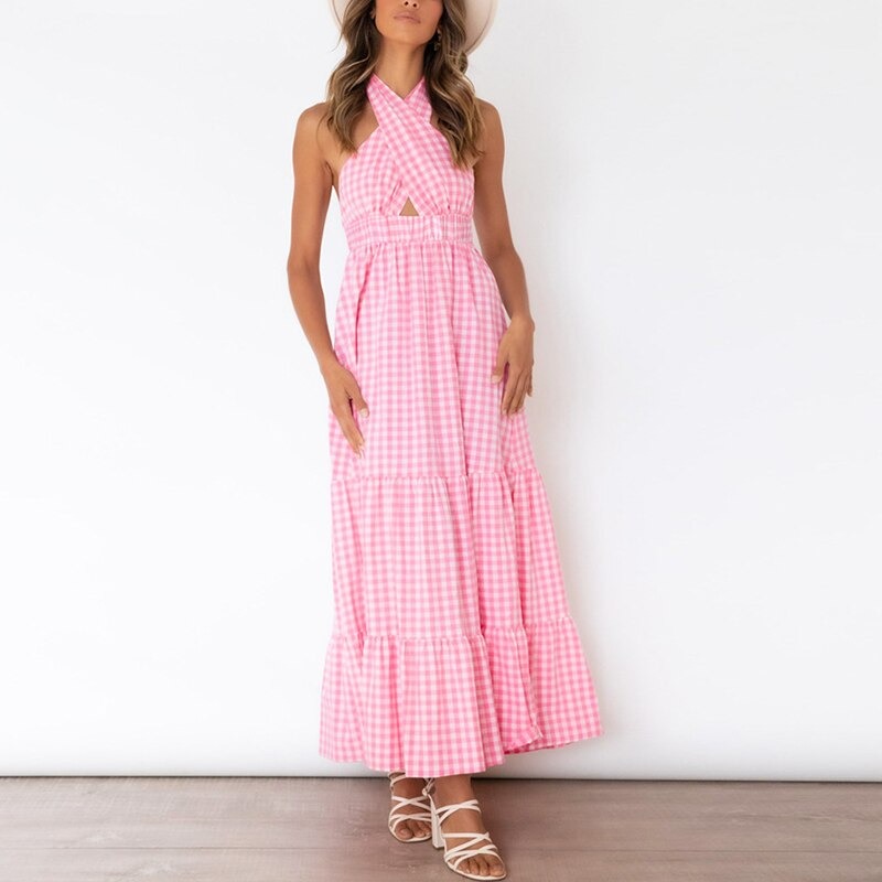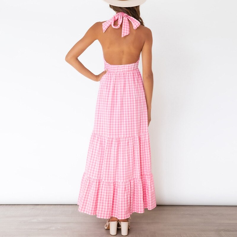 nádherne kockované letné maxi šaty s odhaleným chrbtom. šaty sa uvazujú na krku. pod prsiami je gumička takže sa krásne prispôsobia postave