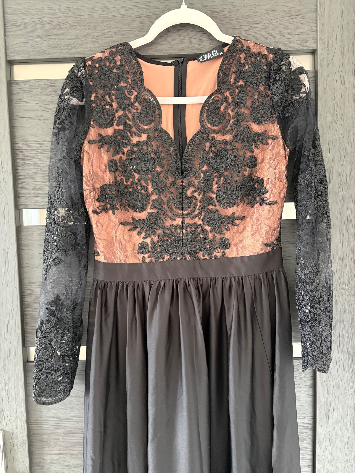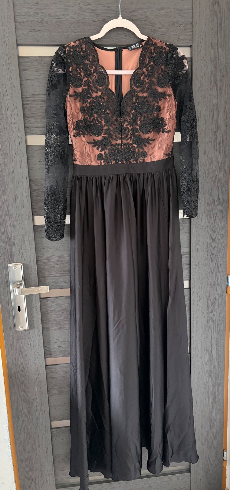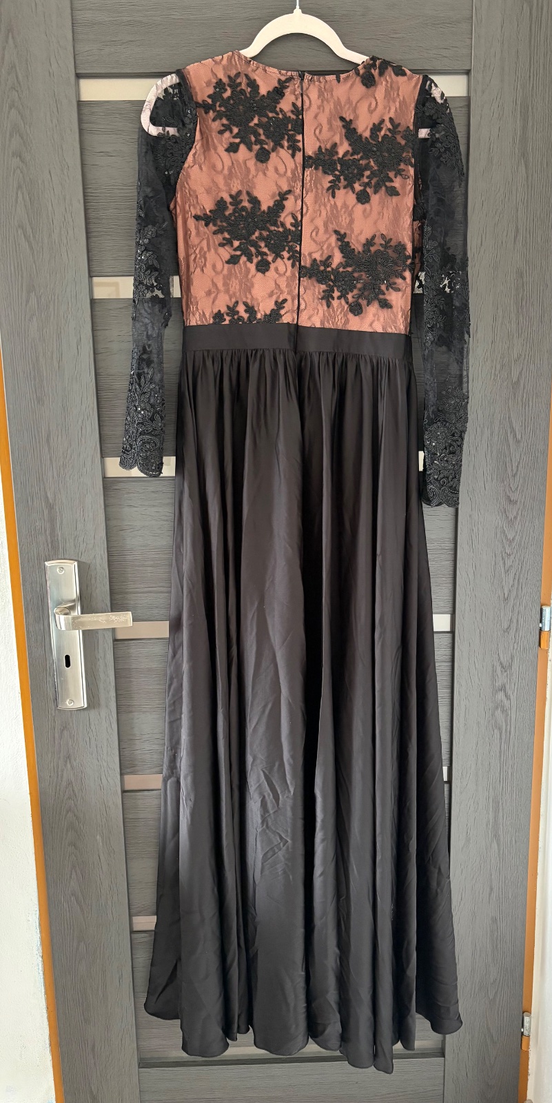 Na predaj, spoločenské šaty, v čiernej farbe, s béžovou, saténové, rozparok na nohe, vzadu na zips. Šaty sú raz použité, vyčistené, bez známok používania.
