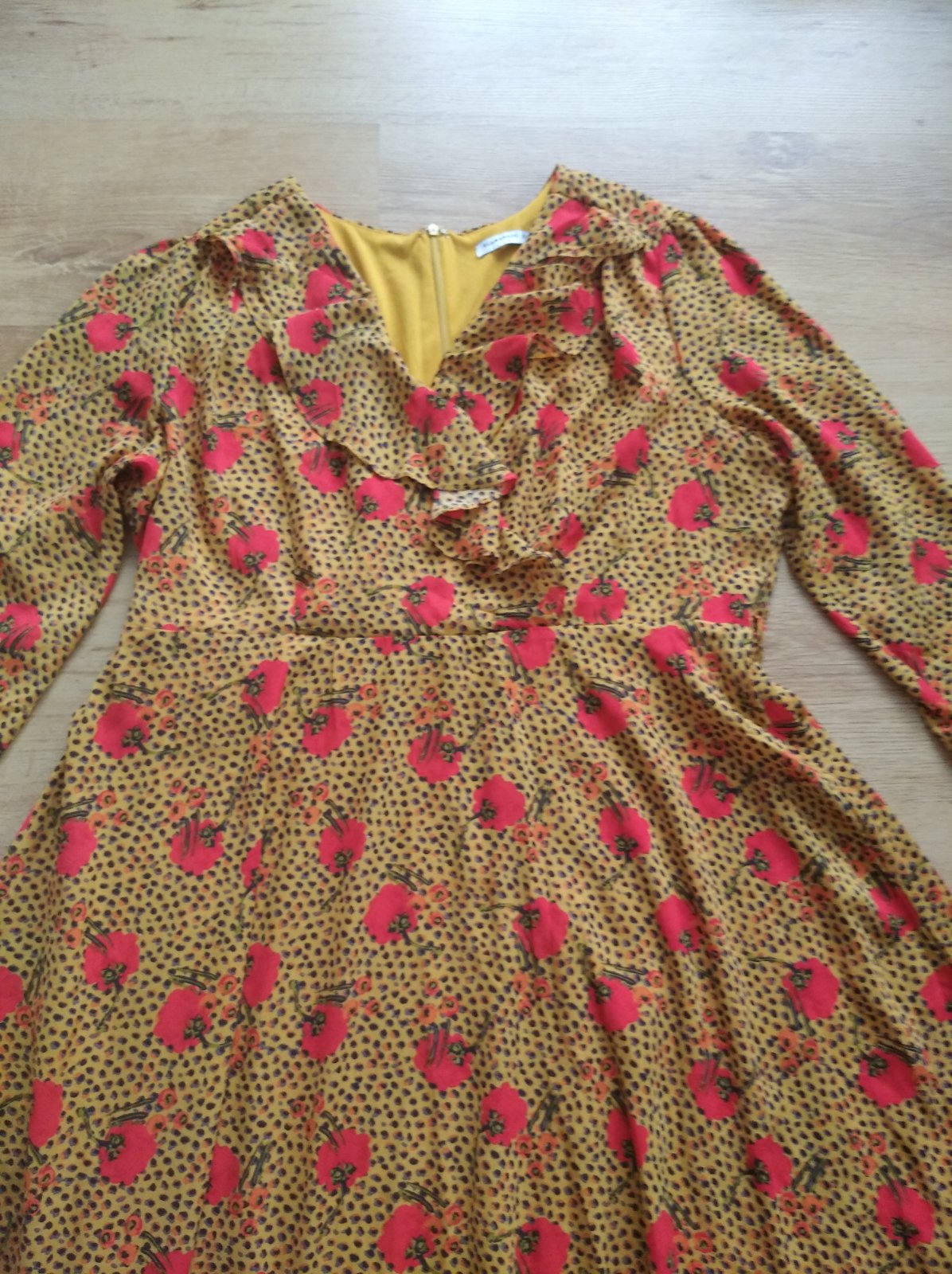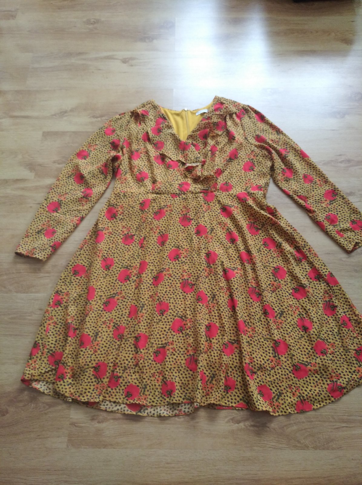 Perfektné šaty z polyesteru, okrem rukávov sú podšité. Dĺžka - 100 cm, šírka pod pazuchami - 2x 57 cm + do A, rukáv od krku - 71 cm. UNI veľkosť, podľa mier 44/46/48.
