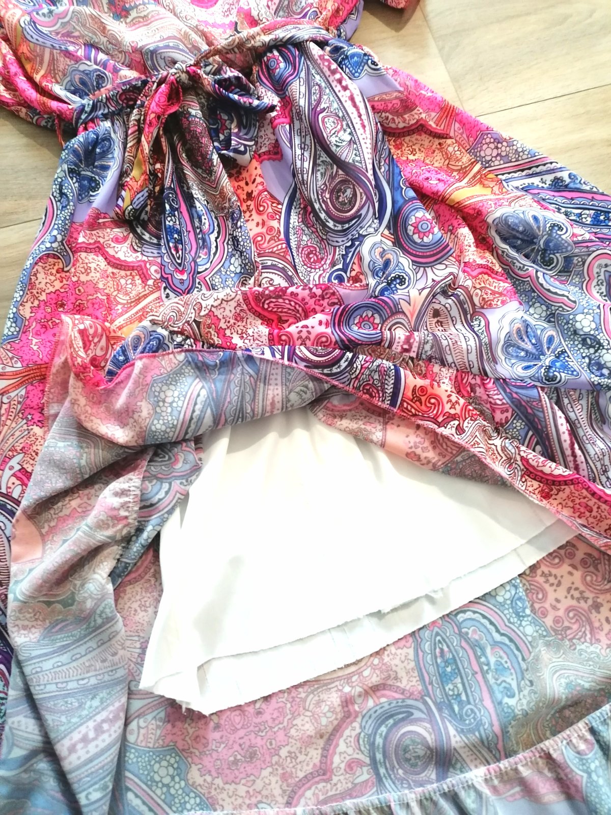 Nádherné letné šaty, ja som ich veľmi rada nosila do prace :) materiál nekrcivy lahucky (polyester), vrch aj spodok cca po kolená sú podsite látkou takže vôbec nepresvitaju. Spodnička sa trosku od krajov para (na foto) , ja som to neriešila, pod šatami to vôbec nie je vidno. Rukávy aj spodok ukončené akoby volanmi, spodok vpredu kratší (cca 94 cm) vzadu dlhší (cca 115 cm). Veľkosť bola uvádzaná UNI a aj tak sadnú keďže sú voľné a v páse sa zaväzujú opaskom. Ja som nosila ako 38 a sedeli pekne. Objednané boli zo stránky Andzela.sk cca za 40€.