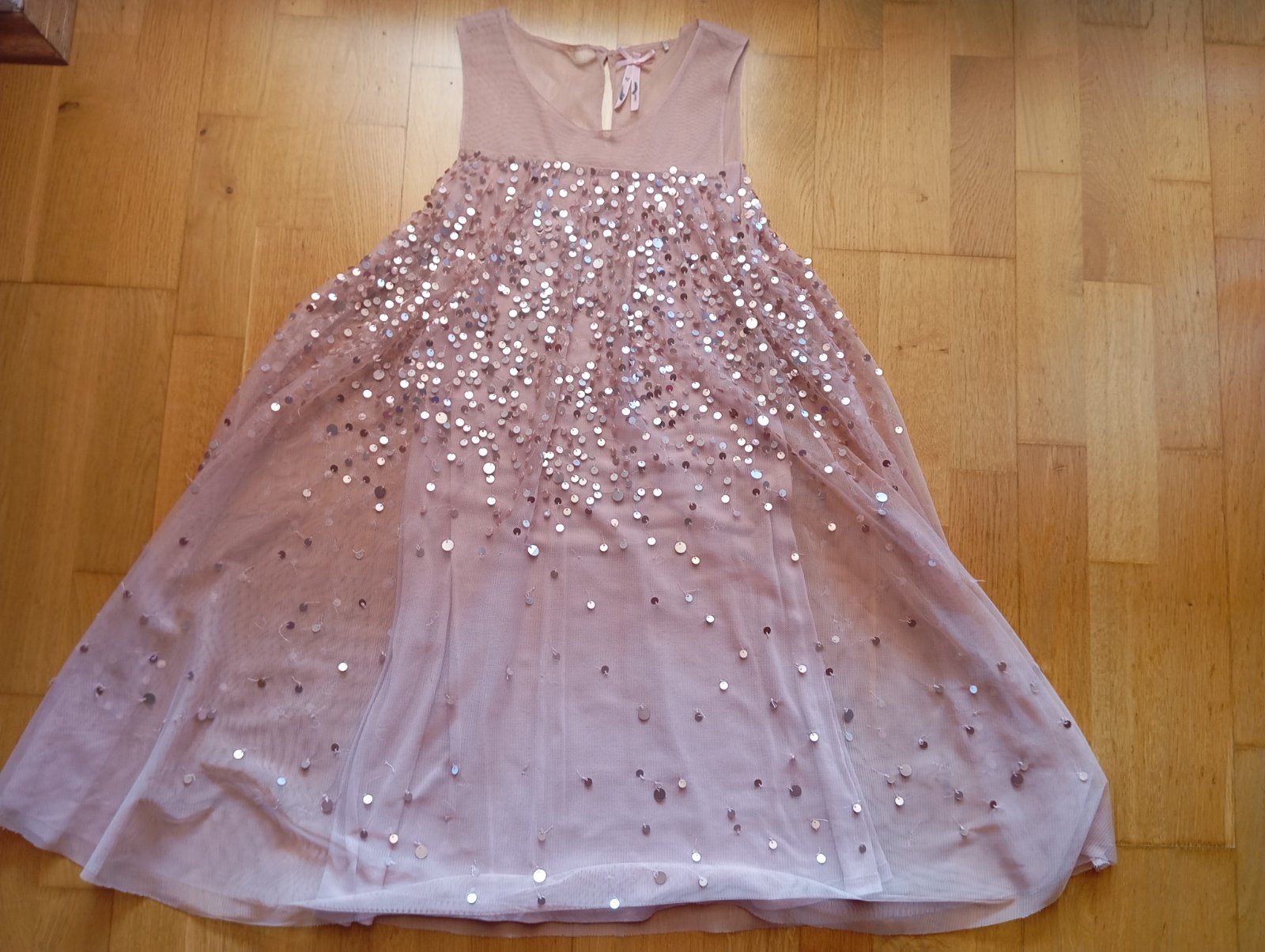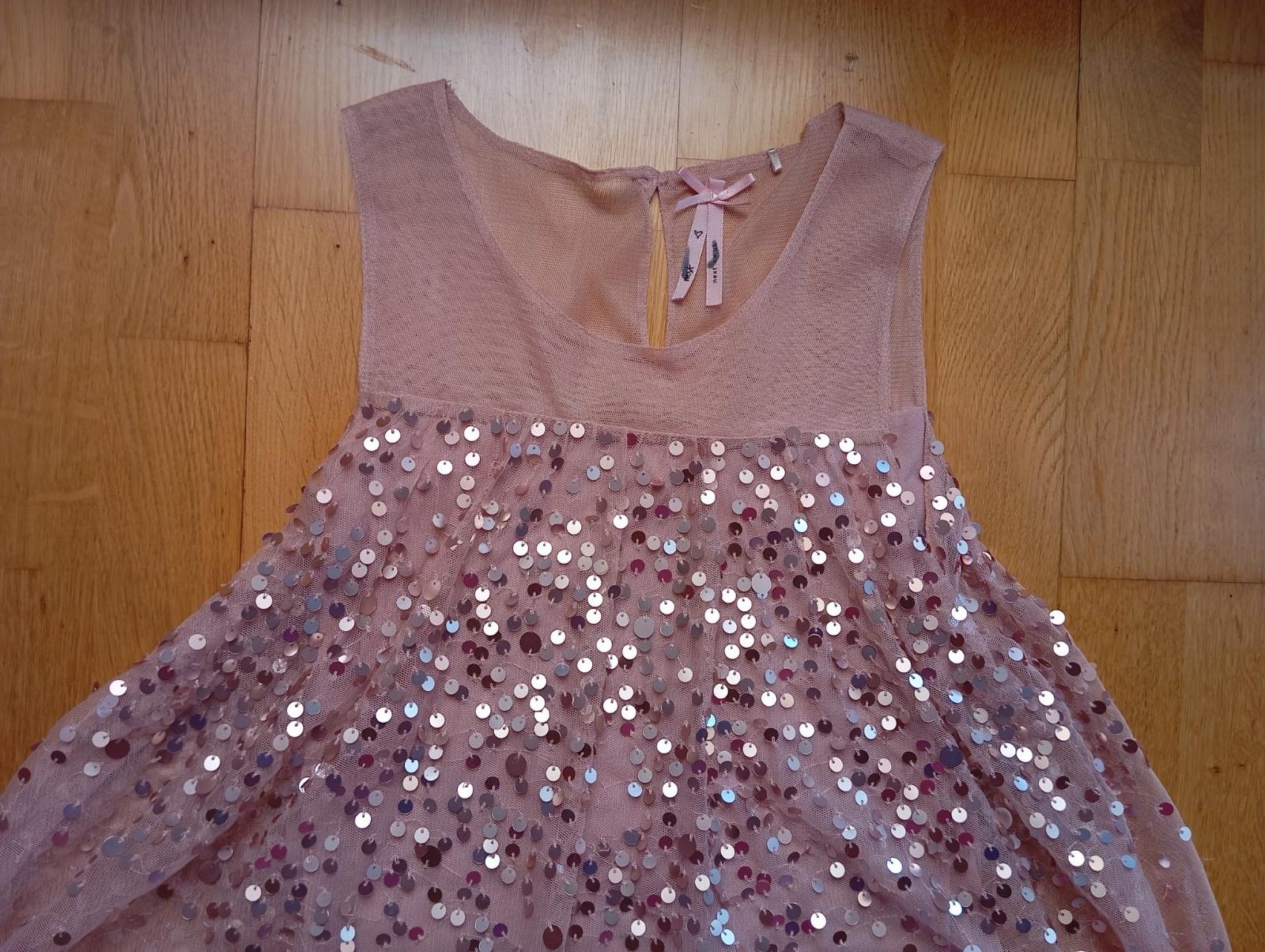 Nádherné trblietavé šaty na príležitosti. Zn. NEXT, velkosť na 9-10 rokov. Pár trblietok však praním odpadlo, inak super stav. Rozmery na posledných 2 foto.
