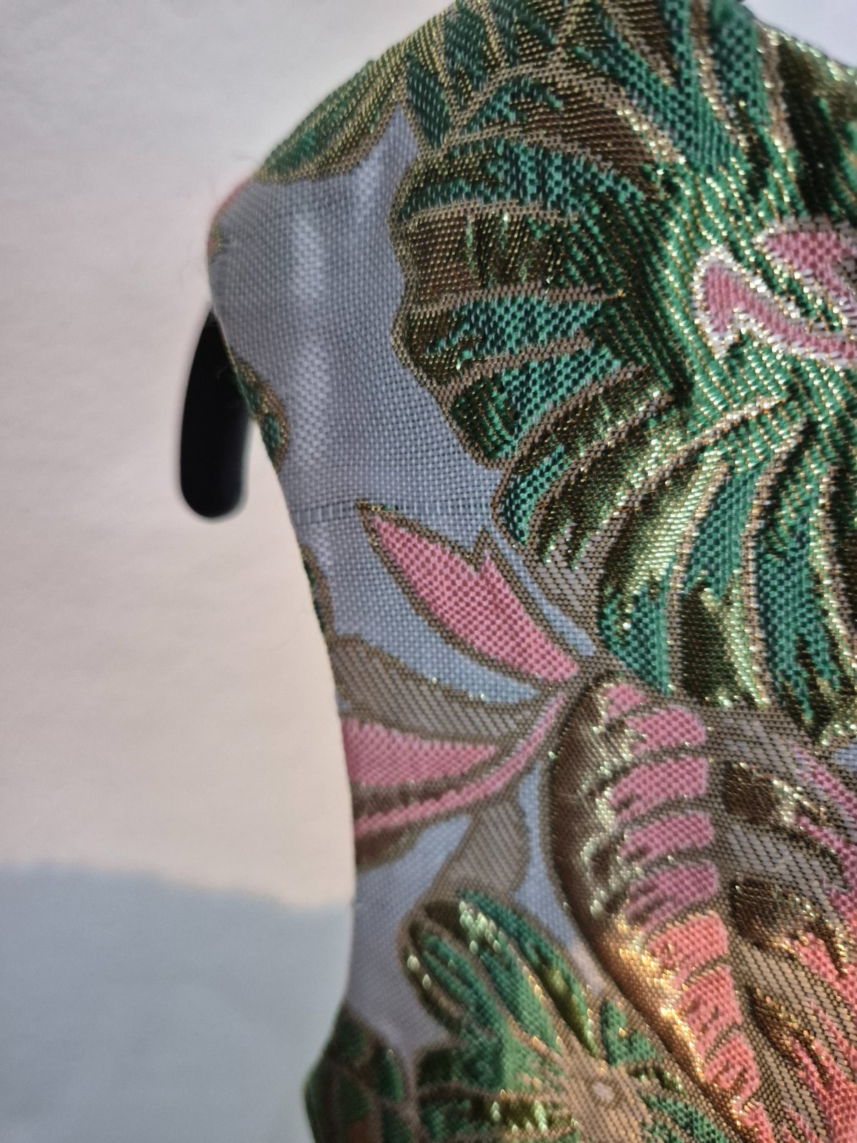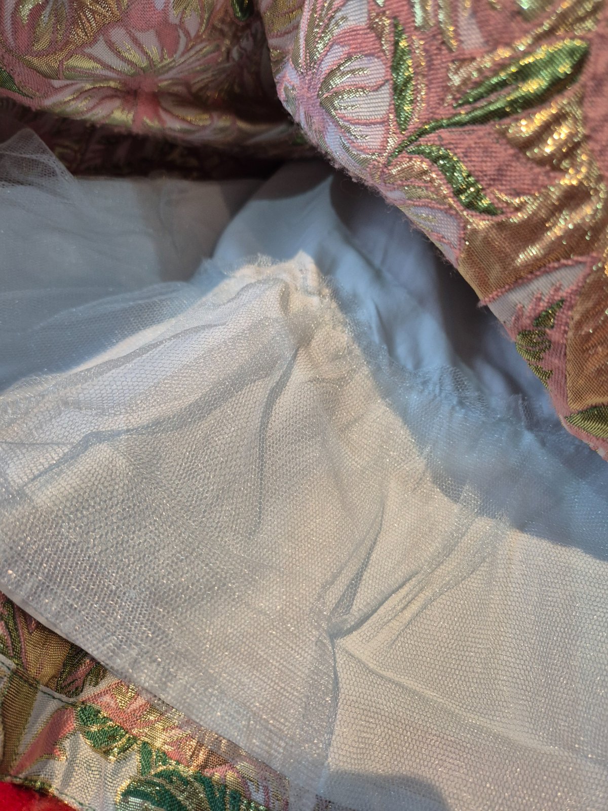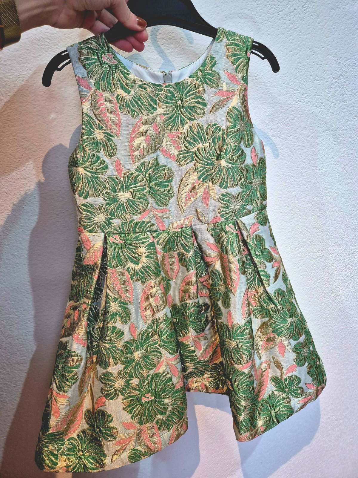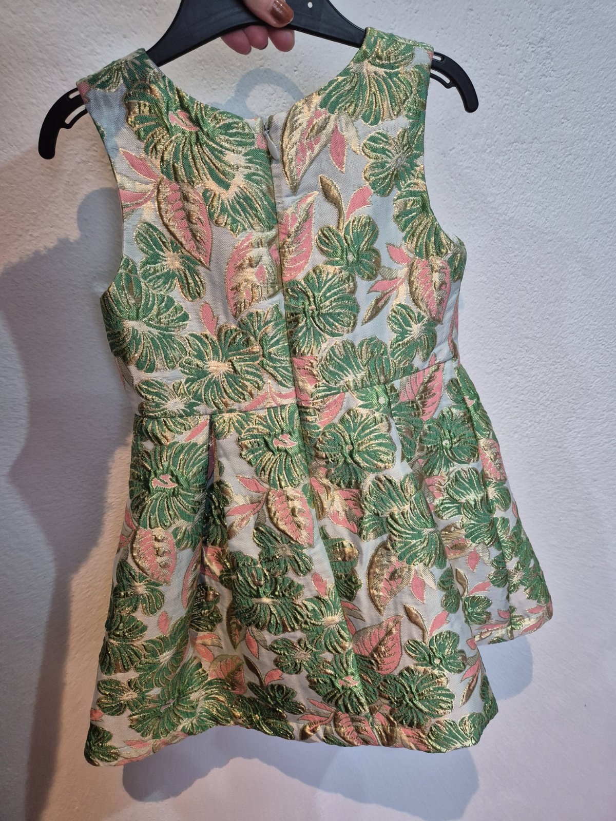 Zelené detské príležitostné šaty bez rukávov sú vhodné na svadbu či oslavu. Krásny vzor listov so zlatou niťou pôsobí slávnostne. Šaty sú na zips a sú z pevnejšieho materiálu, ale vďaka pišitiu neškriabali (opraním sa na pár miestach jemne rozšíril vzor - vidíte na poslednej fotke).