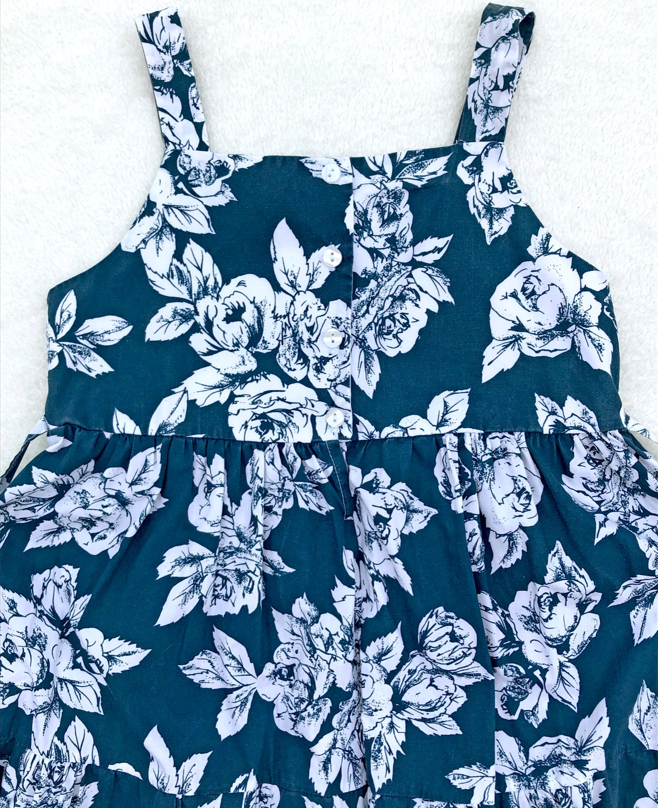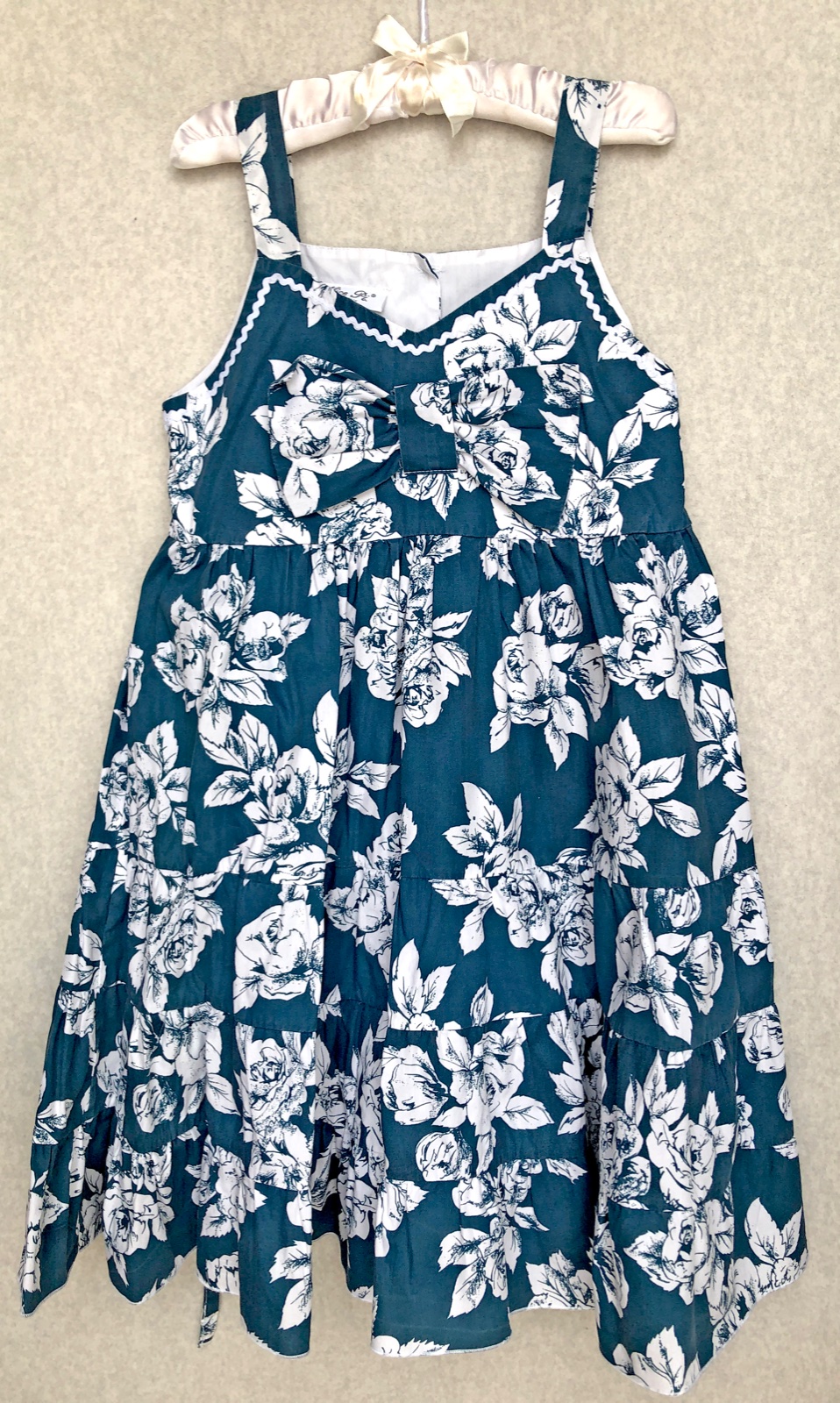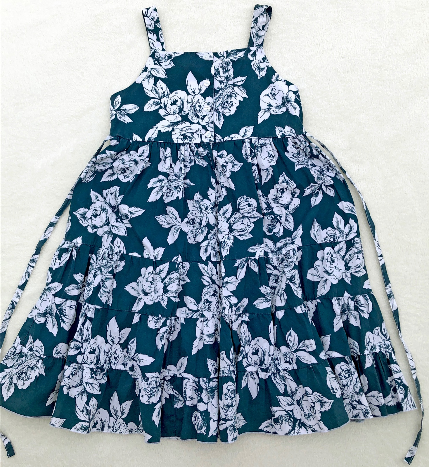 Kvetované bavlnené šaty na leto, zapínanie na gombíky vzadu na chrbte. Vrchný diel je podšitý tenkou bielou bavlnenou látkou. Sukňa je široká riasená do volánov. V páse je uvezovacia šnúrka.