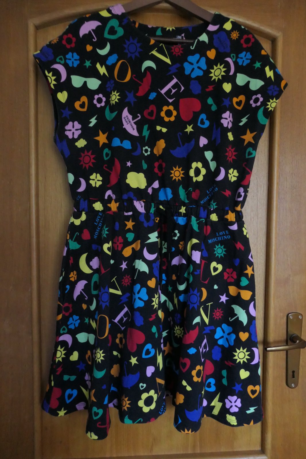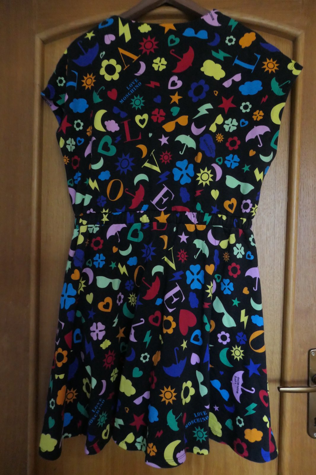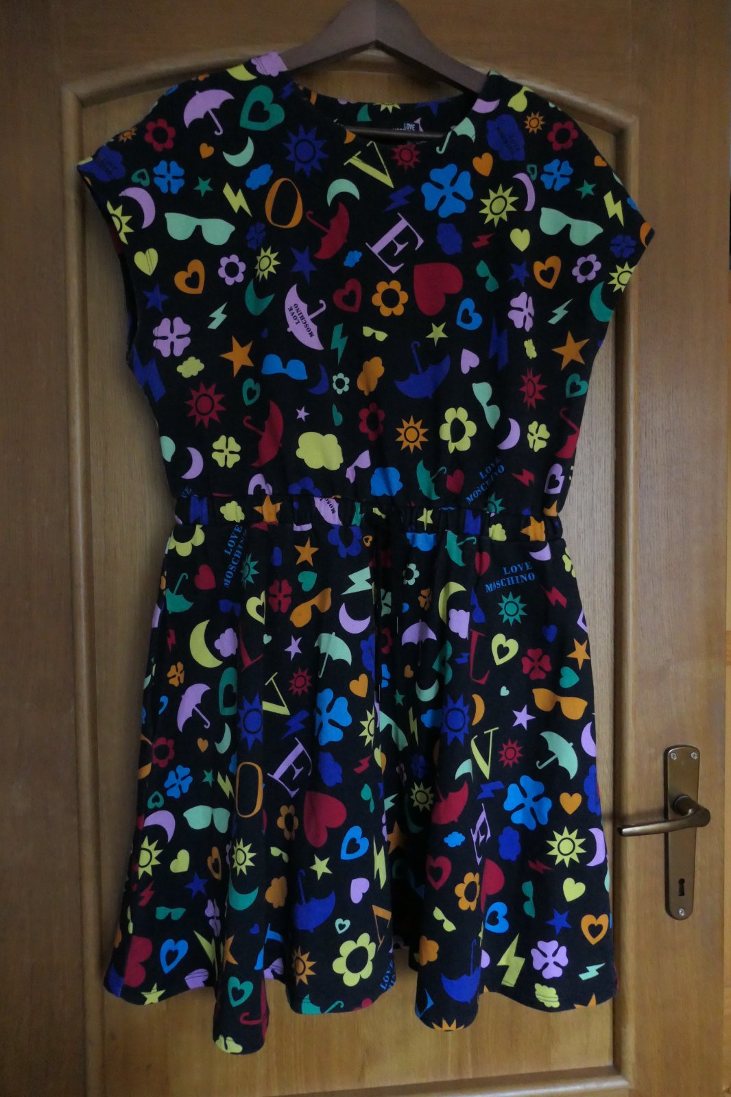 moderne, stylove, trendy, farebne damske saty Love Moschino, vel. 42, tal. 46, v pase regulovatelne, pohodlne, lezerne, prijemne, dva bocne vrecka, ikonicky Moschino vzor aj napisy v krasnych sytych farbach, PC vysoka, bez chybicky, ako nove