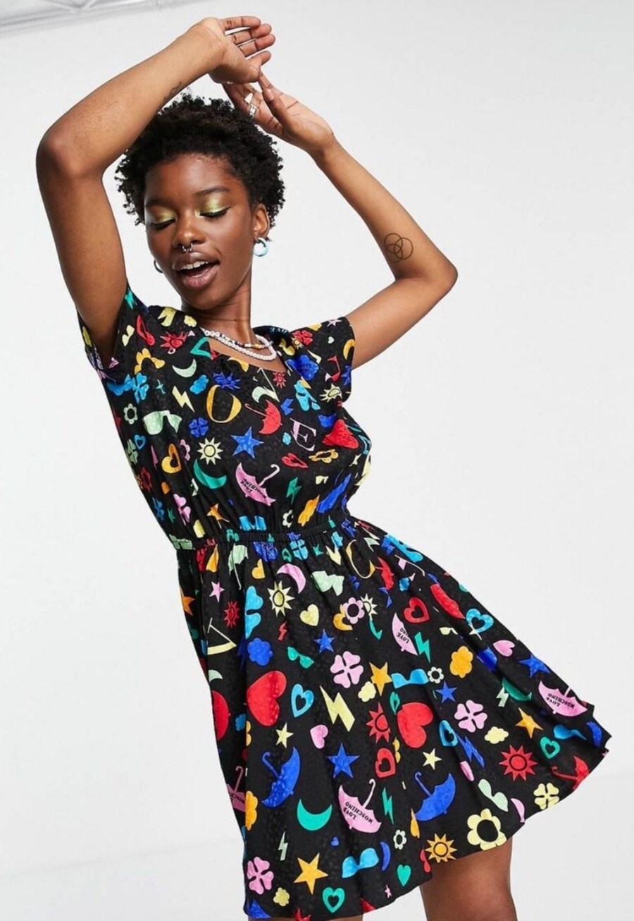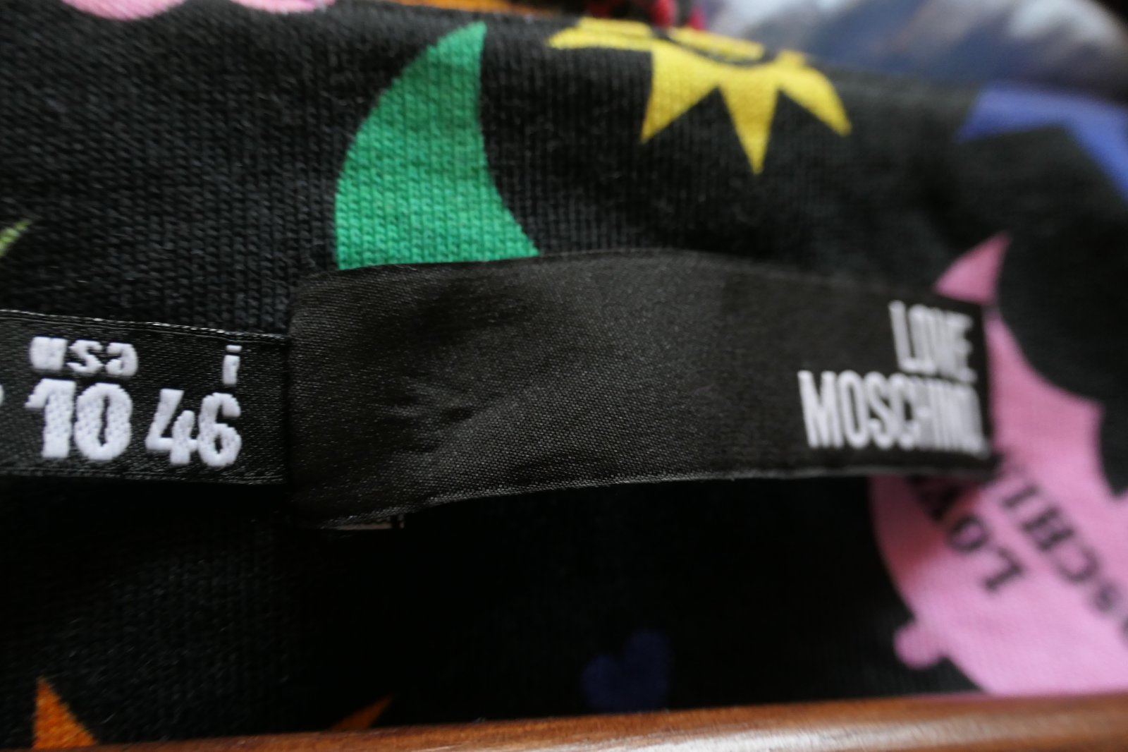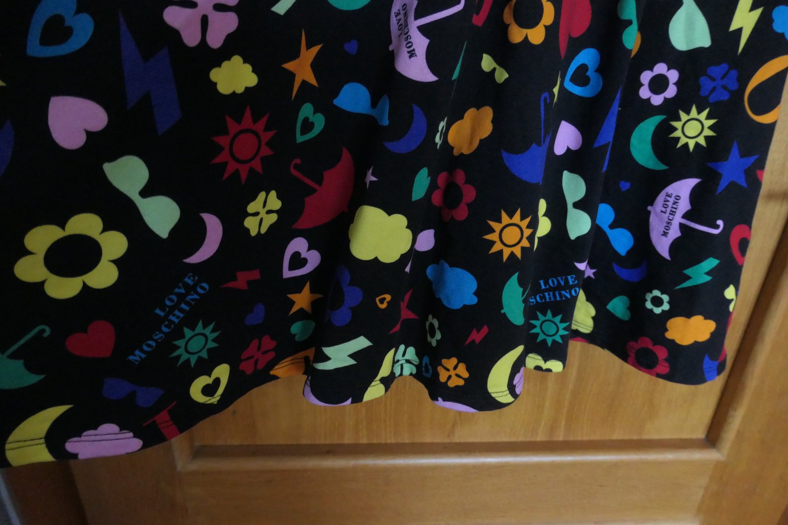 moderne, stylove, trendy, farebne damske saty Love Moschino, vel. 42, tal. 46, v pase regulovatelne, pohodlne, lezerne, prijemne, dva bocne vrecka, ikonicky Moschino vzor aj napisy v krasnych sytych farbach, PC vysoka, bez chybicky, ako nove