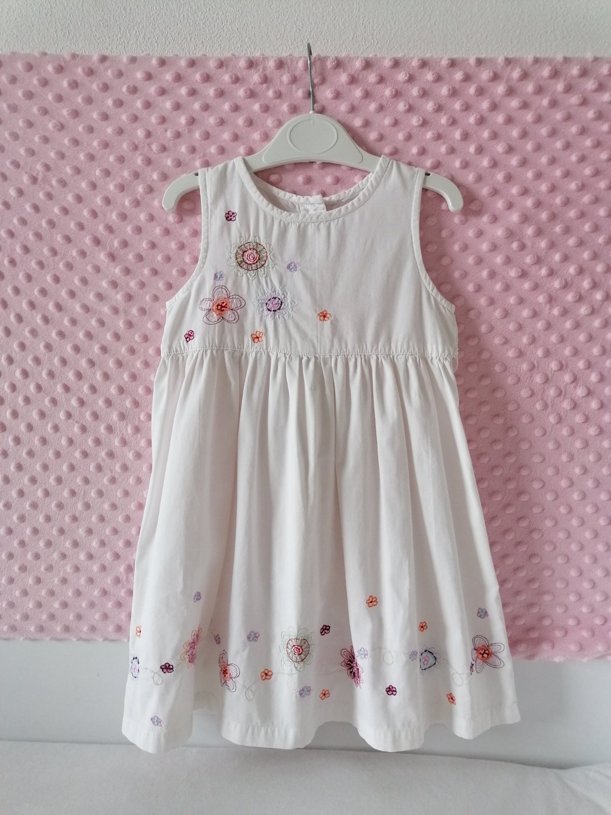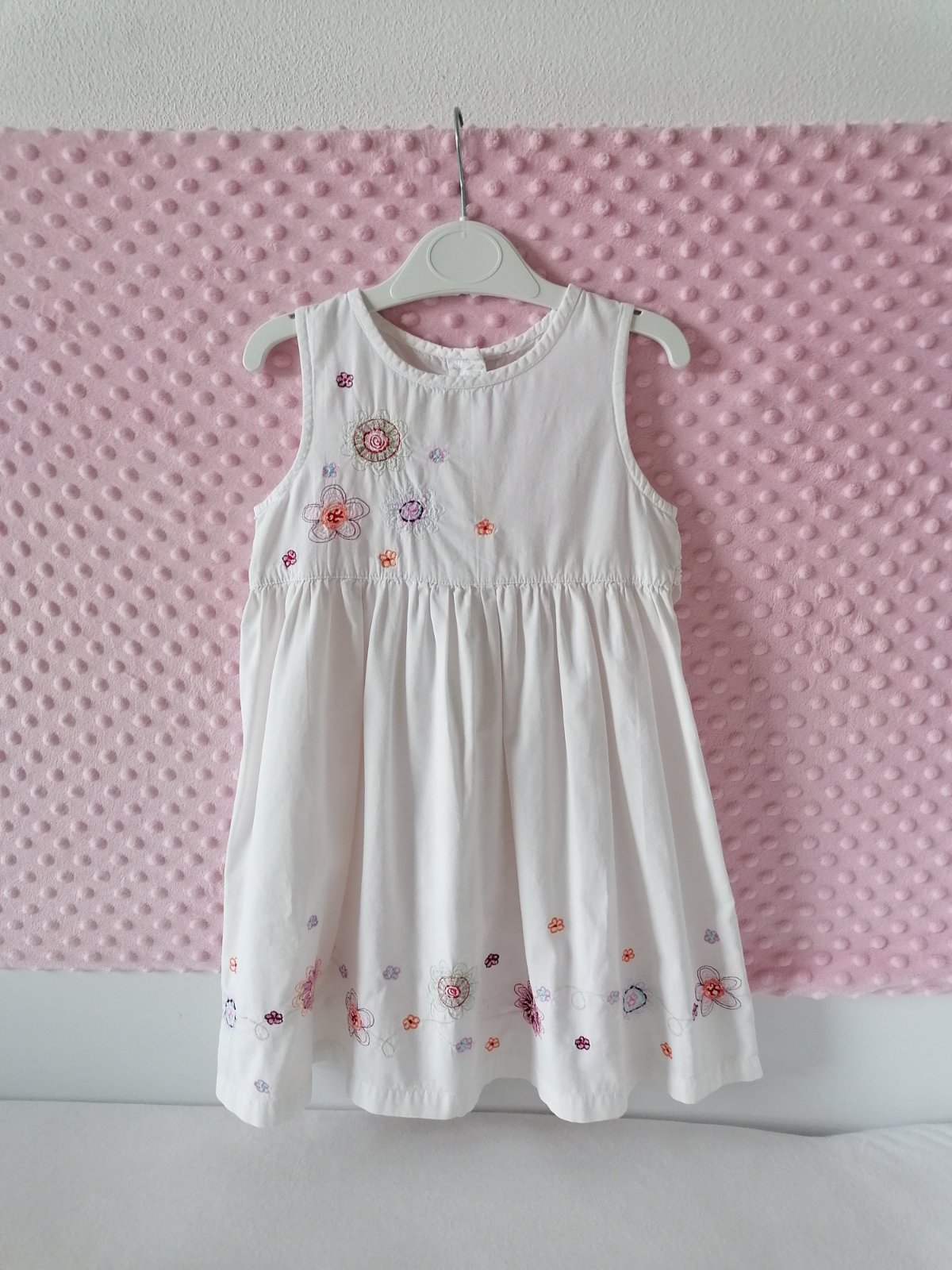 Biele šatočky s vyšitými farebnymi kvetmi, vzadu mašľa na uviazanie. Vhodne na bezne aj prilezitostne nosenie. Velmi dobry stav.
