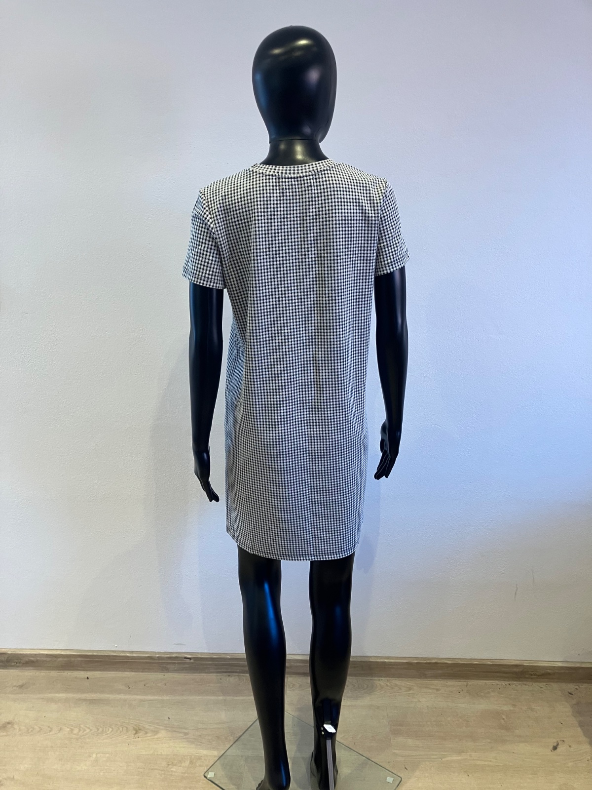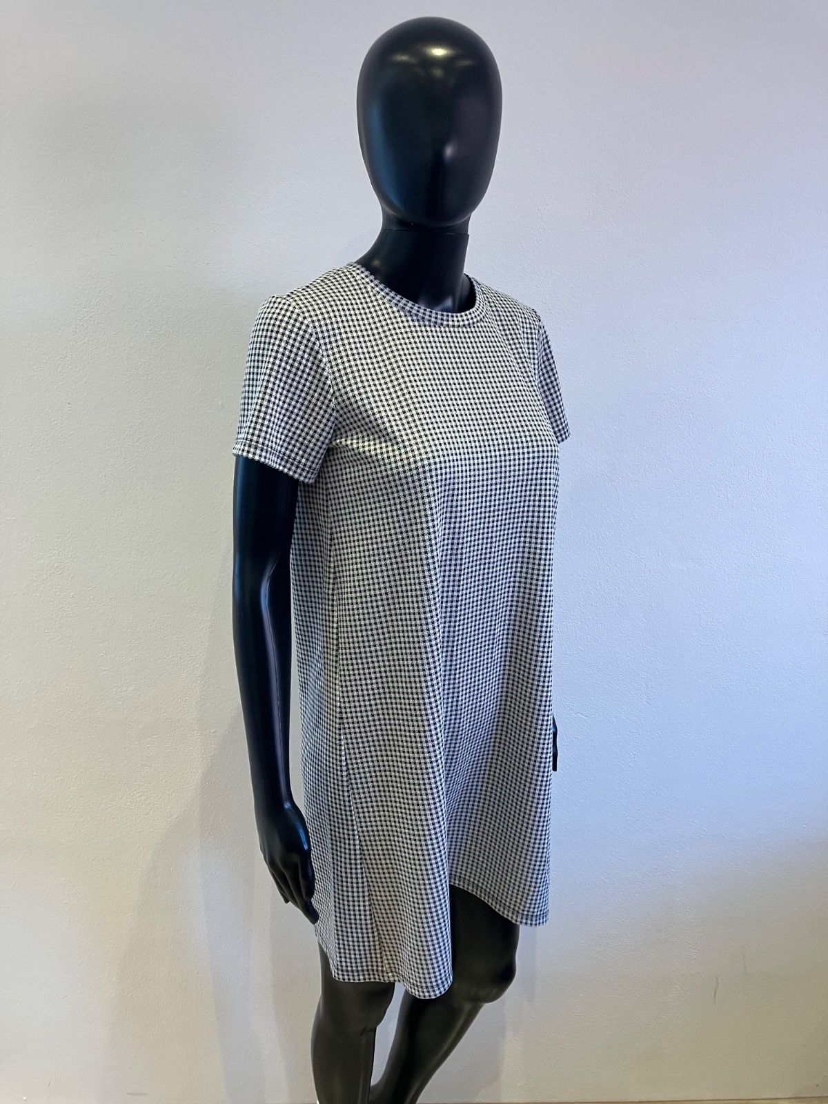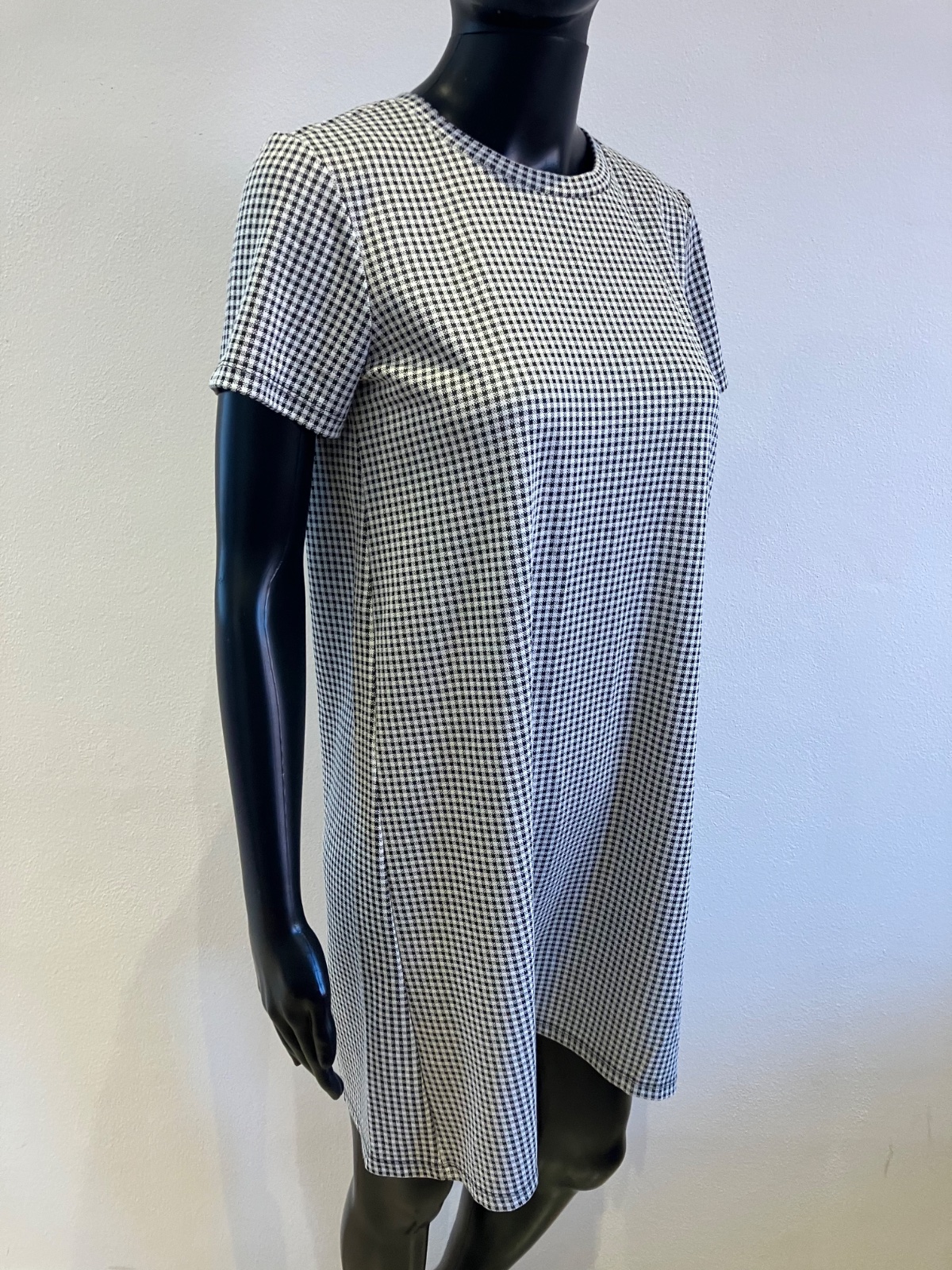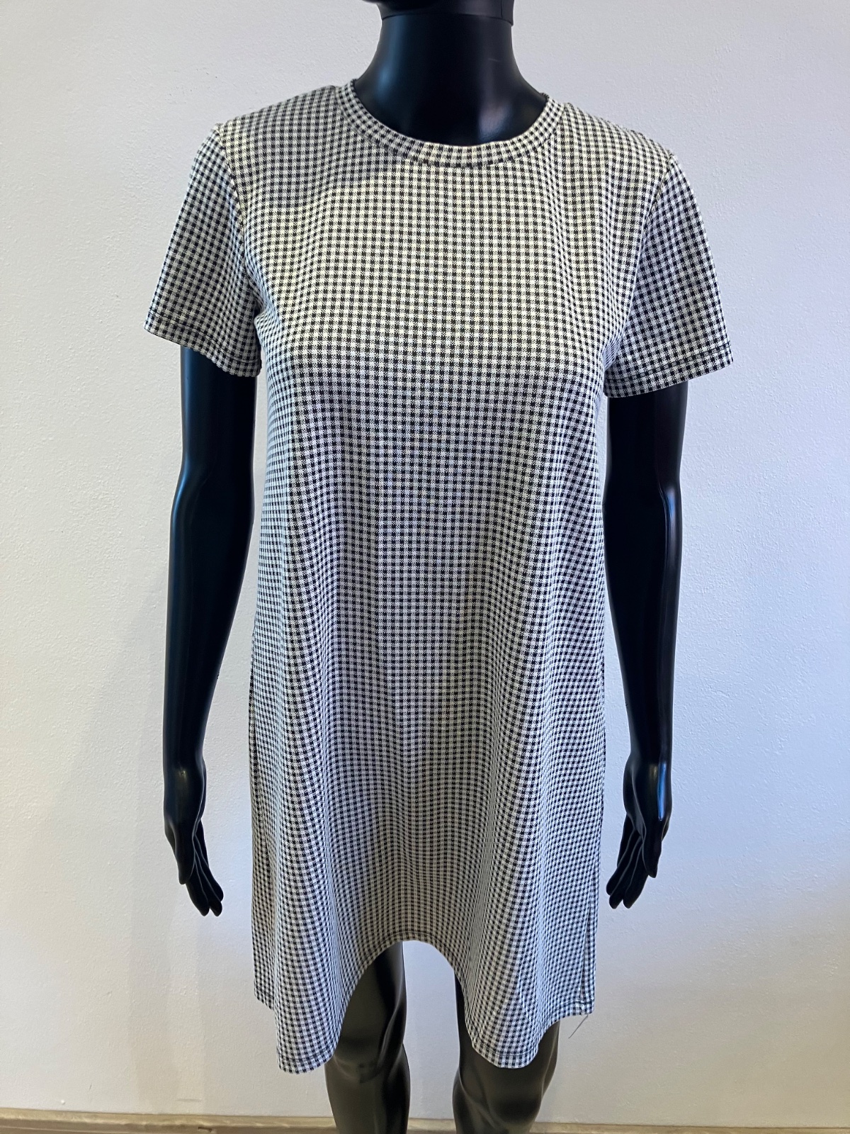Dámske šaty s krátkym rukávom, čiernobiele, kockované, tenké, elastické.