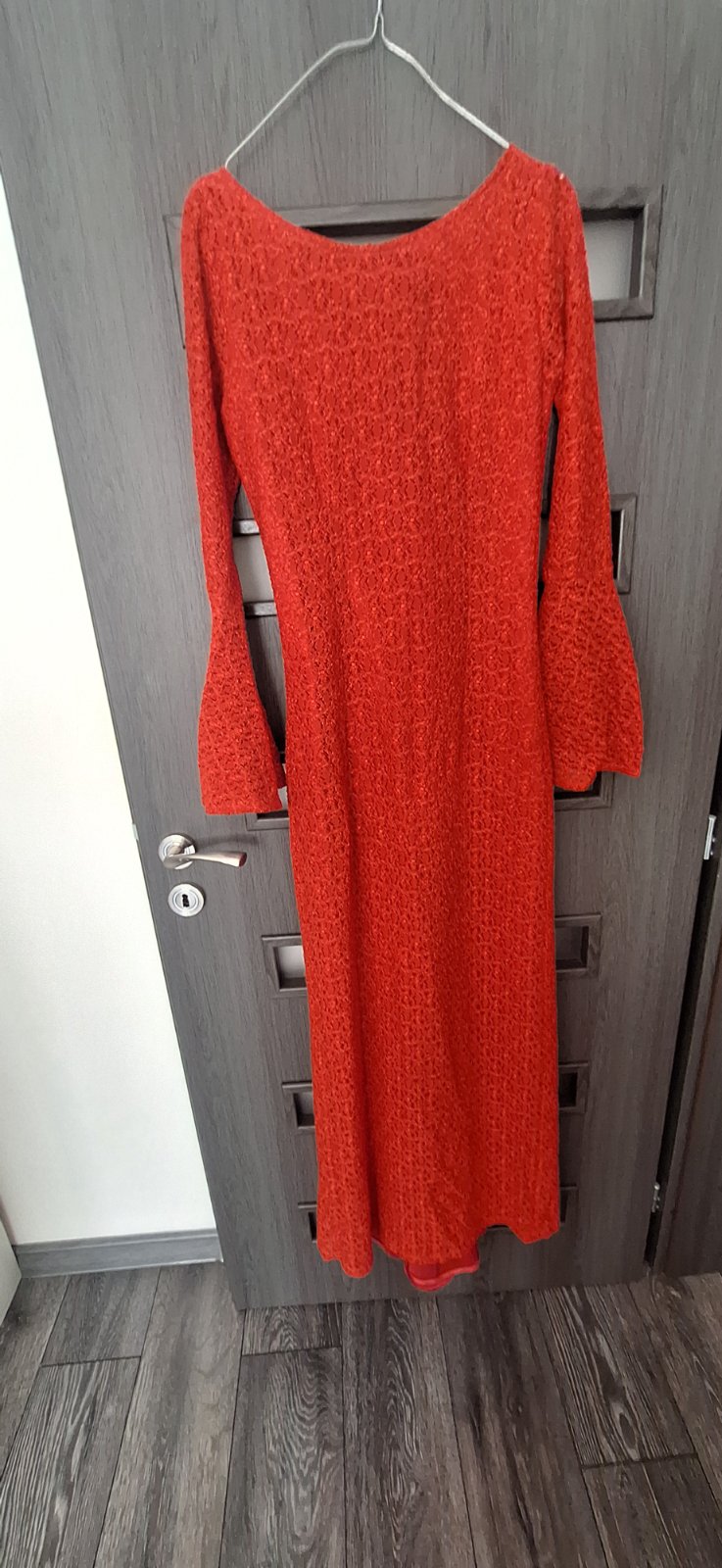 Dlhé červené čipkované šaty,podšité saténom.Šité na mieru.Rukávy od laktov rozširené,všitá vlečka a výstrih na chrbte.