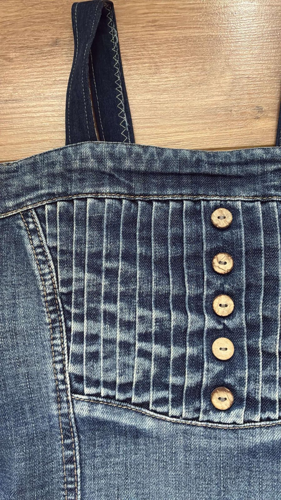 Predám štýlové šaty v tmavomodrej farbe, majú veĺmi pekný prepracovaný strih s ozdobným prešívaním na hrudi, 5 ozdobných gombíkov, tri rady volánov na sukni, pre ľahšie obliekanie je na boku skrytý zips 28cm dlhý, d=65 cm bez ramienok, š prsia=33cm, š pás=29cm, vzadu 4cm široká guma, materiál bavlnený denim s malým podielom elastanu, visačka je odstrihnutá zn. asi H&M, top stav.