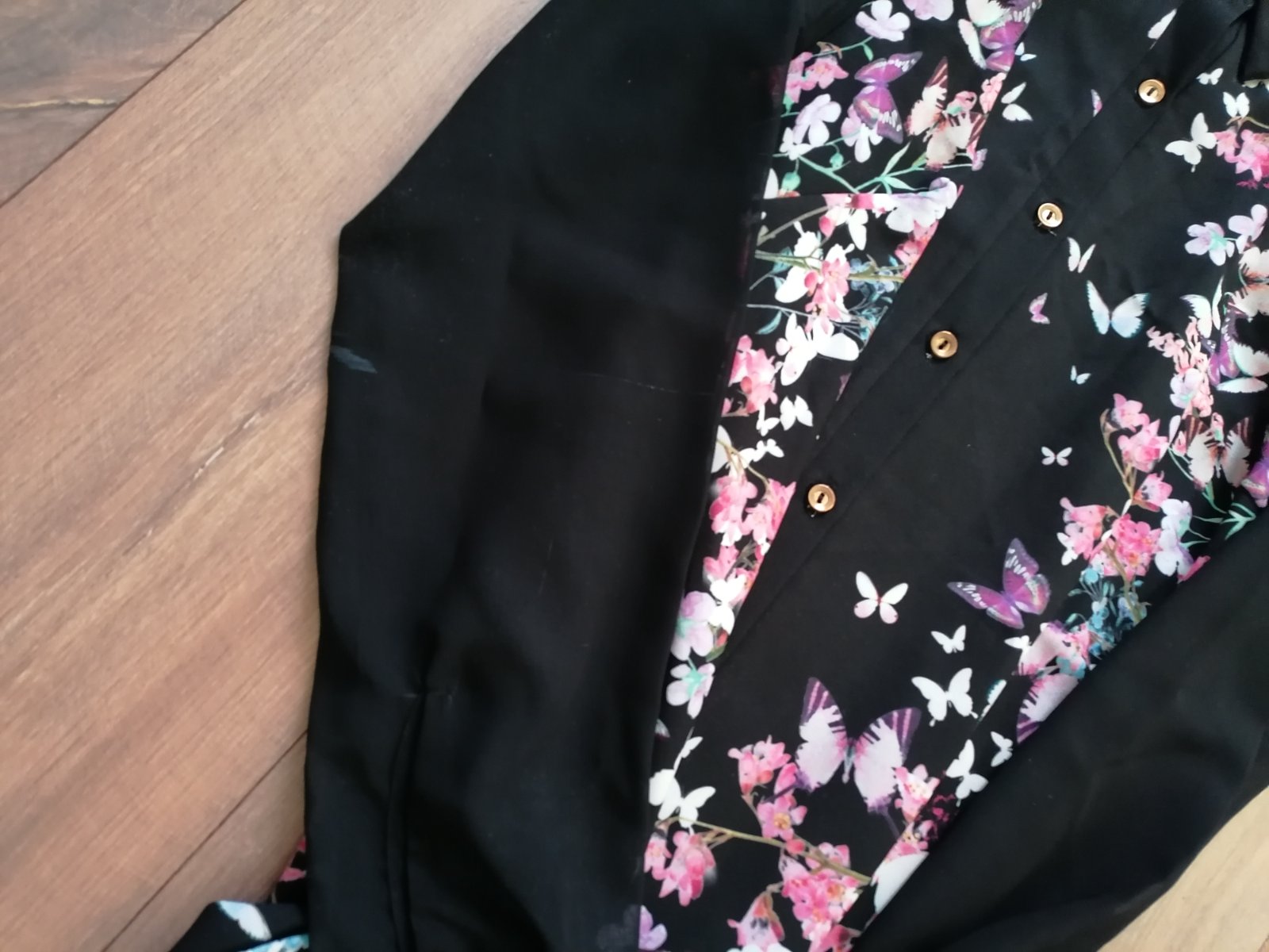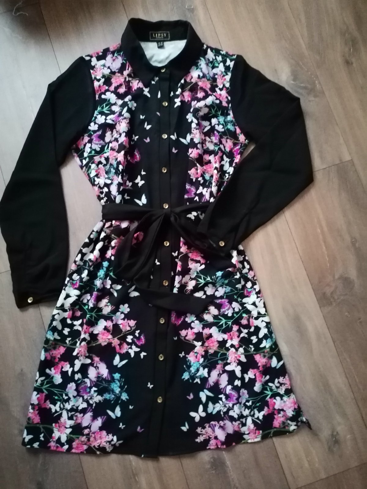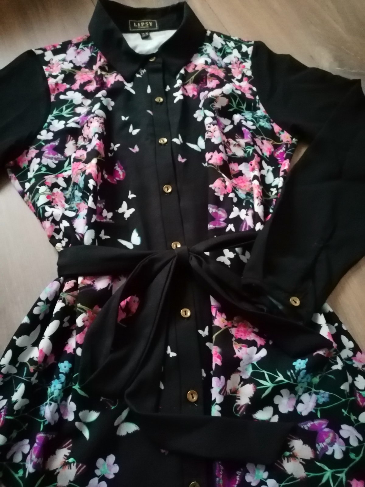Krásne ľahučké šaty, môžu sa nosiť aj na bežné nosenie, ja som mala ako hosť na svadbe. Rukávy sú priesvitnejšie, stred šiat nepriehľadný s krásnym motívom kvetov a motýľov. V páse majú opasok, pekne formujú postavu. Top stav,akorat na jednom rukáve majú bledsie miesto, prišli mi tak už nové, asi výrobná chyba. dĺžka 91 cm, šírka v prsiach 47 cm.