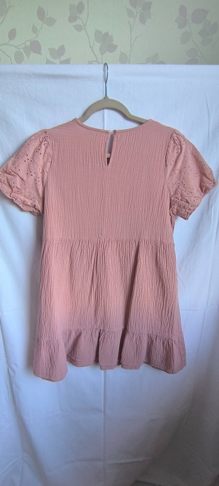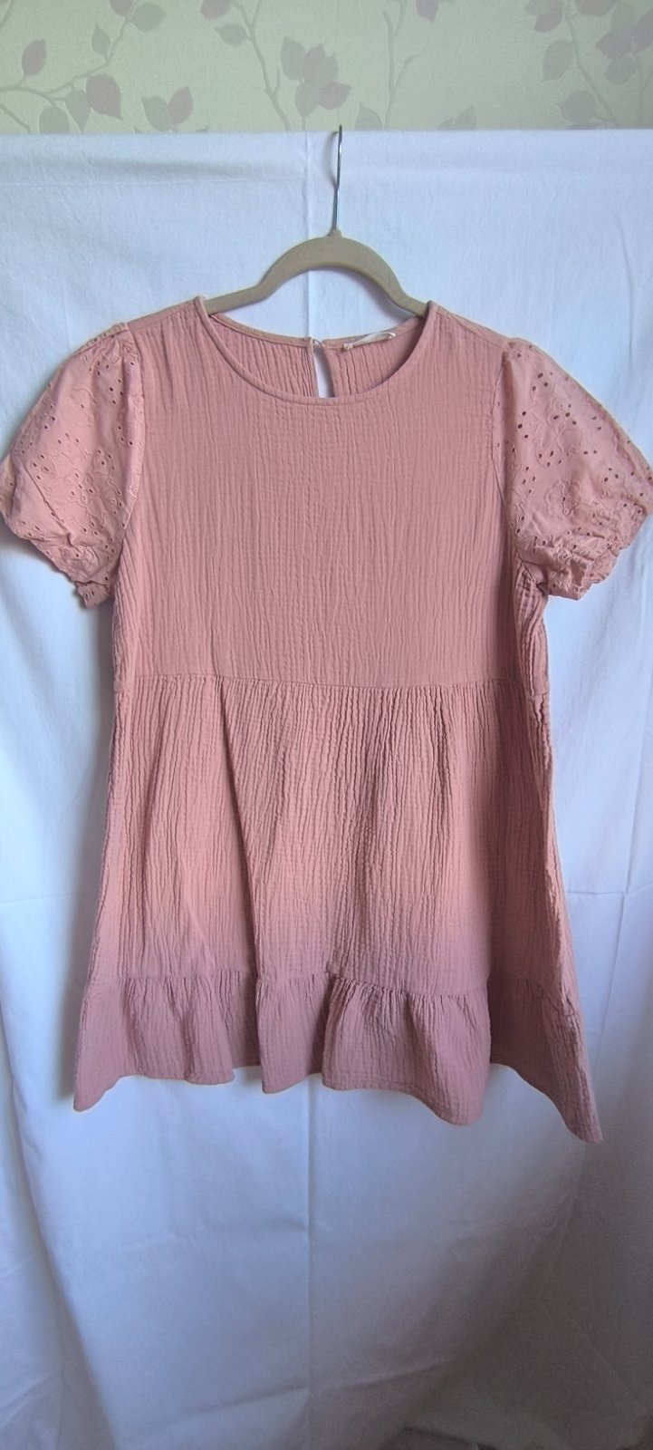 Málo nosené šaty, bez poškodení, strih do A, madeirové rukávy. Šírka cez prsia 2x51cm, dĺžka 82cm.