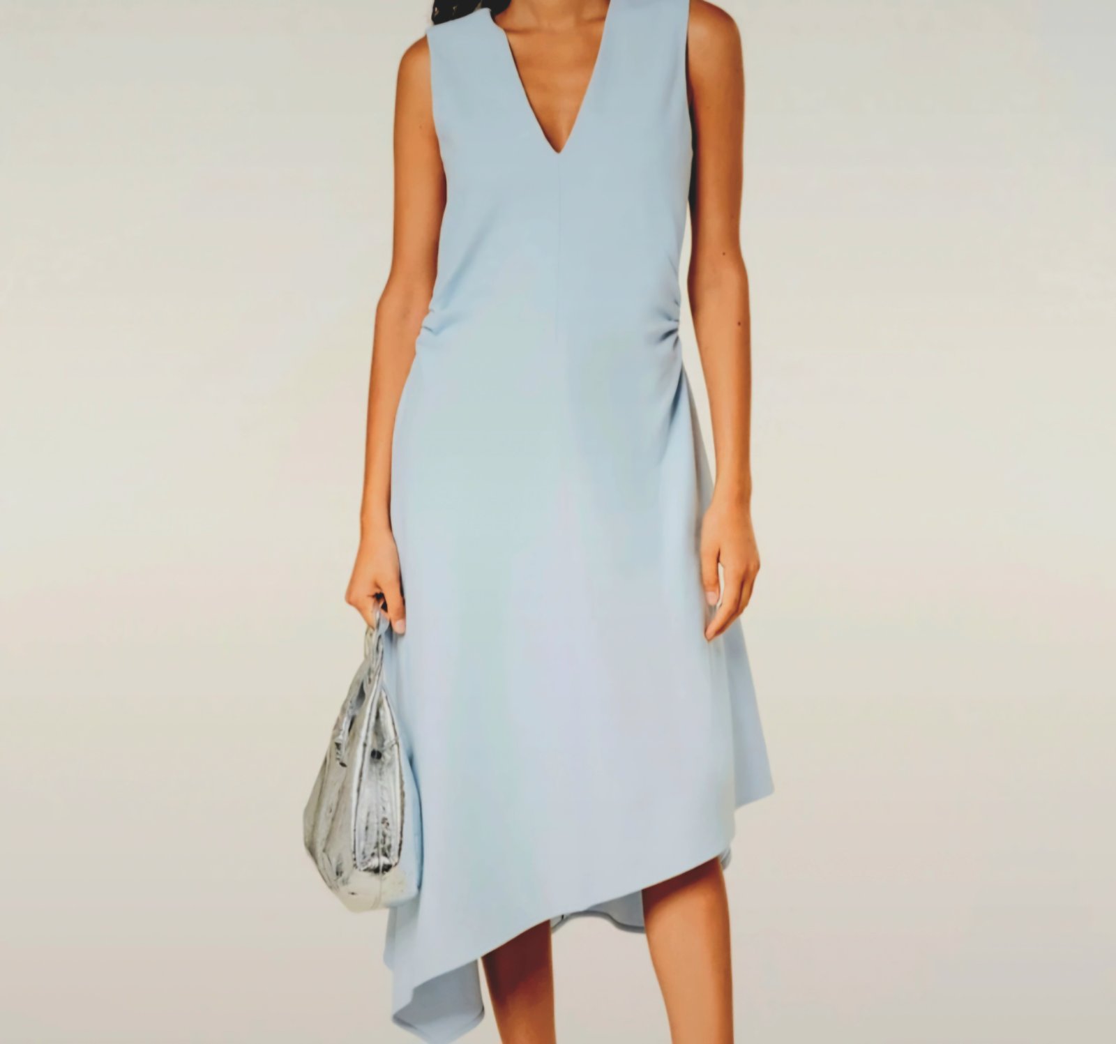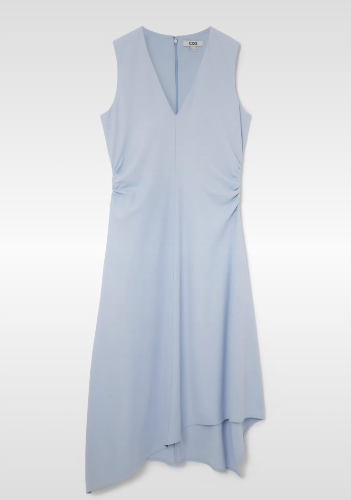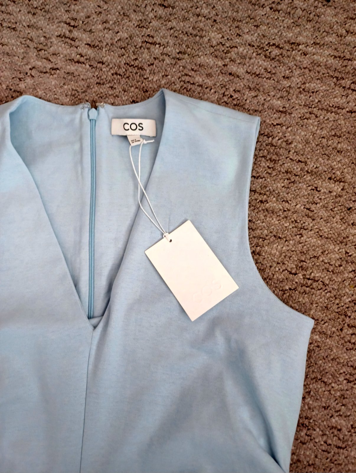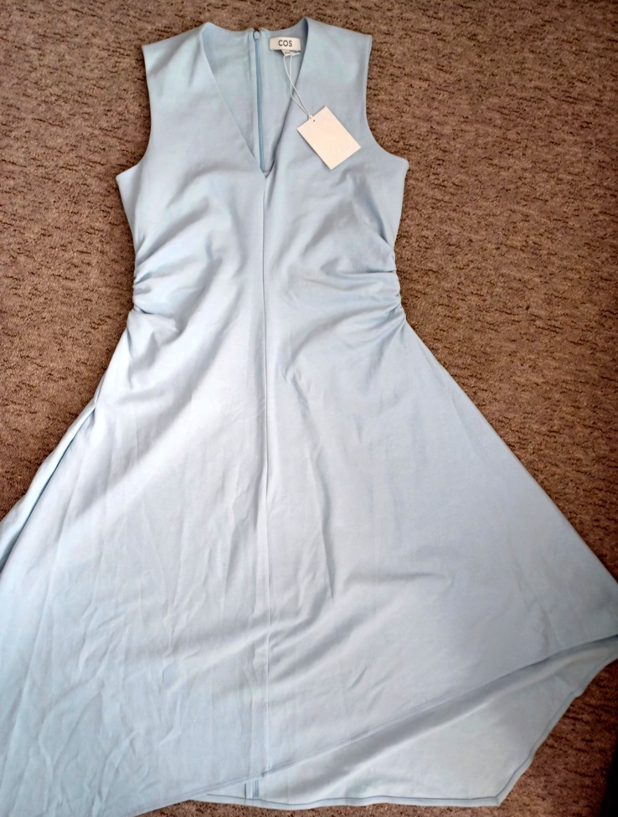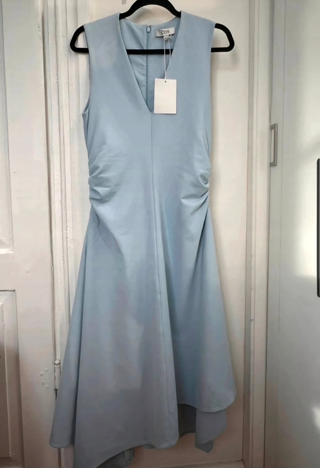 Krásne svetlomodré šaty od COS, veľkosť M. Veľmi pekne sedia. Výstrih vpredu do V. Boky sú nariasené čím sú tieto minimalistické šaty zaujímavé. Pružný materiál. Max dĺžka 120cm, podpažie/prsia 49 cm, ramená 37cm, pás 44cm