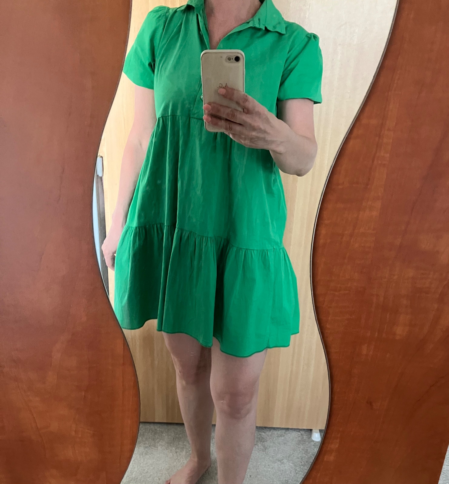 oversize jednoduché šaty hrubšie, povrch jemne meniaci farba tmavozelená smaragdová, tmavšia než na fotke, v peknom nosenom stave. Majú jeden mikrofliačik od laku na golieri.