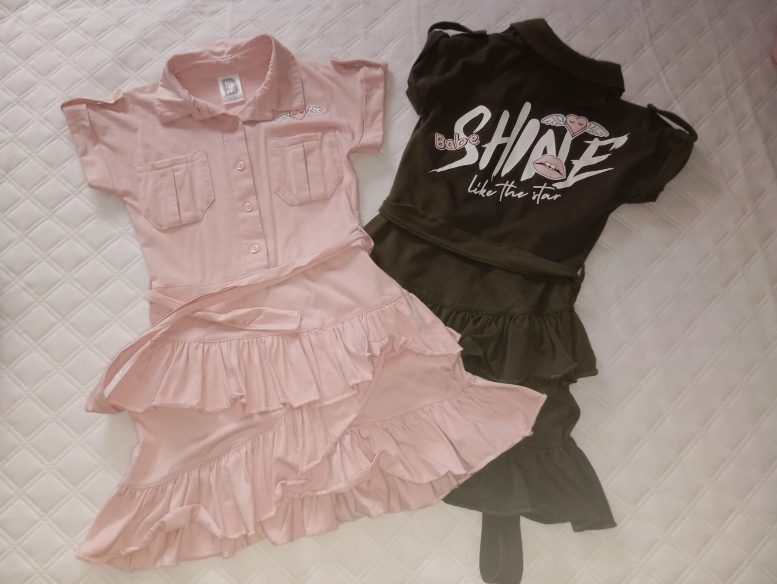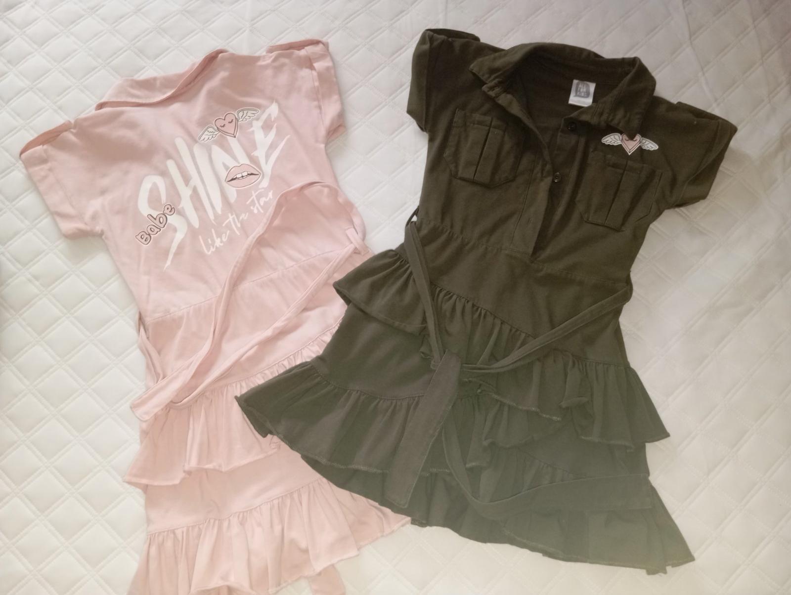 Cena kus.. olivová a ružová farba.. 128/134, ale sedia na 122/128.. preto sme ich nevynosili.. sú krásne