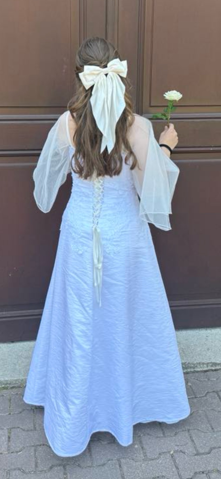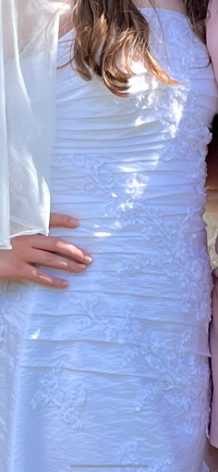 Krásne svadobné šaty, vzadu majú šnurovačku, prispôsobia sa postave. Kvalitné, rukáv prispôsobený v salóne aj s tylom. Pôvodne sú korzetové, čiže sa dá odpárať.