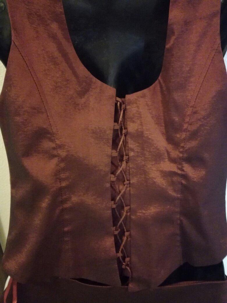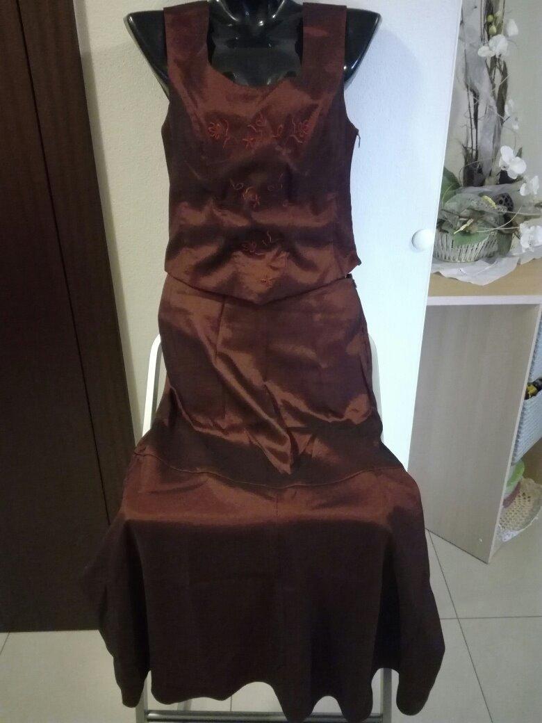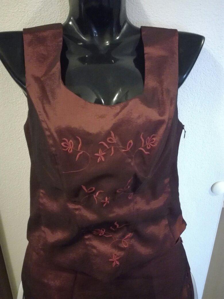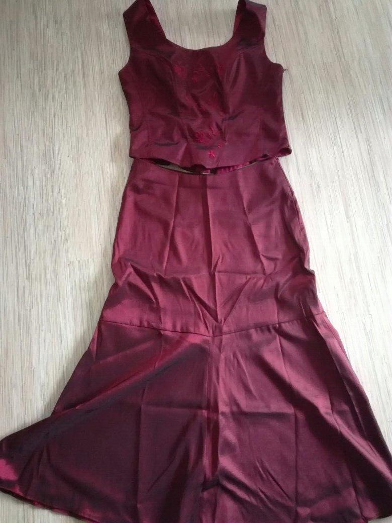 Šaty na spoločenskú udalosť, ples atď., pozostávajú z topu a sukne, topík je vzadu šnurovací (na boku má aj zips, sukňa má zips na boku)takže sa ešte prispôsobí presne na postavu, vpredu výšivka. Treba len prežehliť, v top 100% stave, 1 x boli oblečené, pekná sýta tmavočervená (vínovo-bordová) farba. Rozmery: