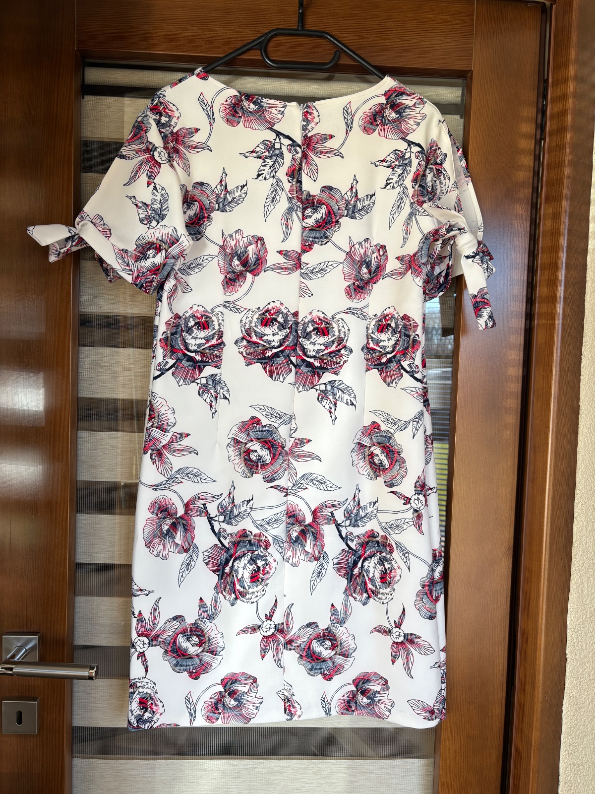 Krásne letné šaty. Na gombíčky. Pevný materiál. Veľ.písaná L ale podľa mňa M. Detail -mašličky na rukávoch Detail -klopy nad prsiami s gombíčkom