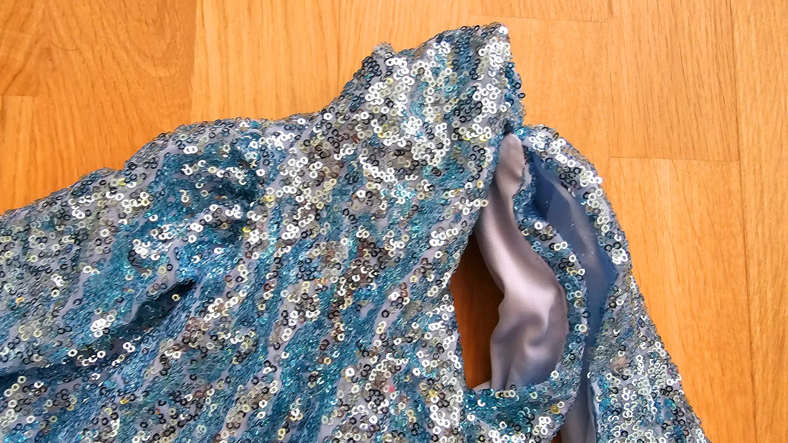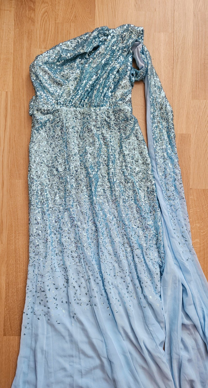 Výborný stav, takmer nové. Oblečené len 1x na ples. Bohato zdobené flitrami. Šírka cez prsia max 51x2 cm (elastické), šírka v páse 37x2 cm, dĺžka 160 cm. Zapínanie vzadu na zips. Na jednom pleci elegantná šála.
