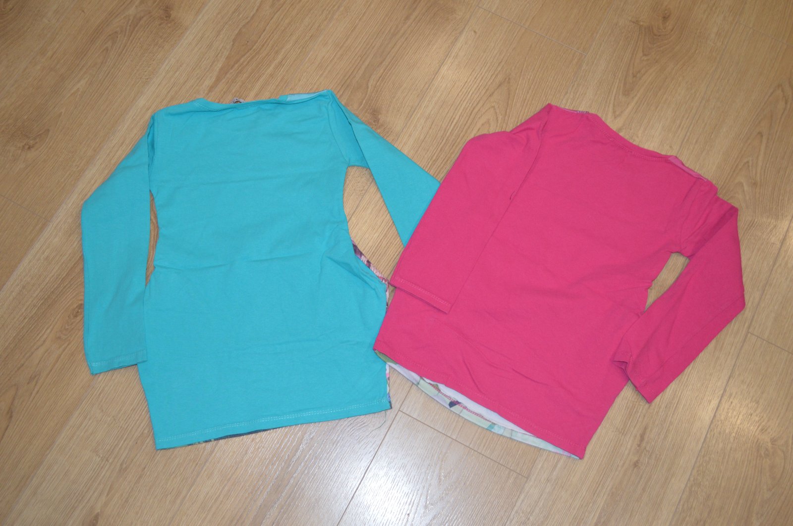 2x šaty/predĺžené tričko, jemne zateplené, uvedená veľkosť 122 ale zodpovedá veľkosti 110/116, na zelených je fľak na rukáve