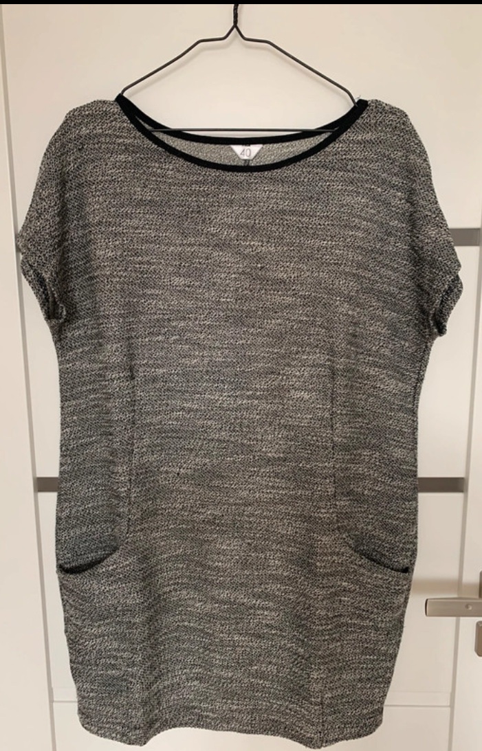 Mini šaty s 2 vreckami v odtieni sivý melír a s čiernym lemom okolo krku na krátky rukáv.