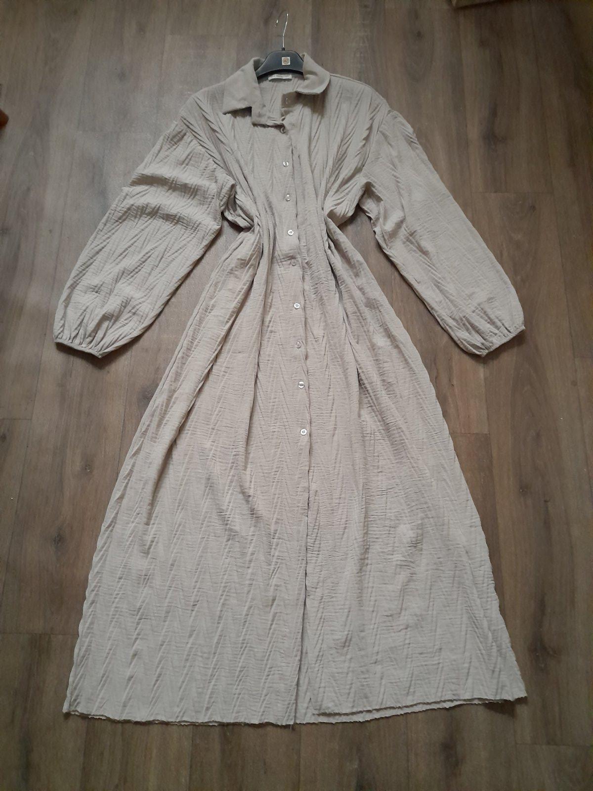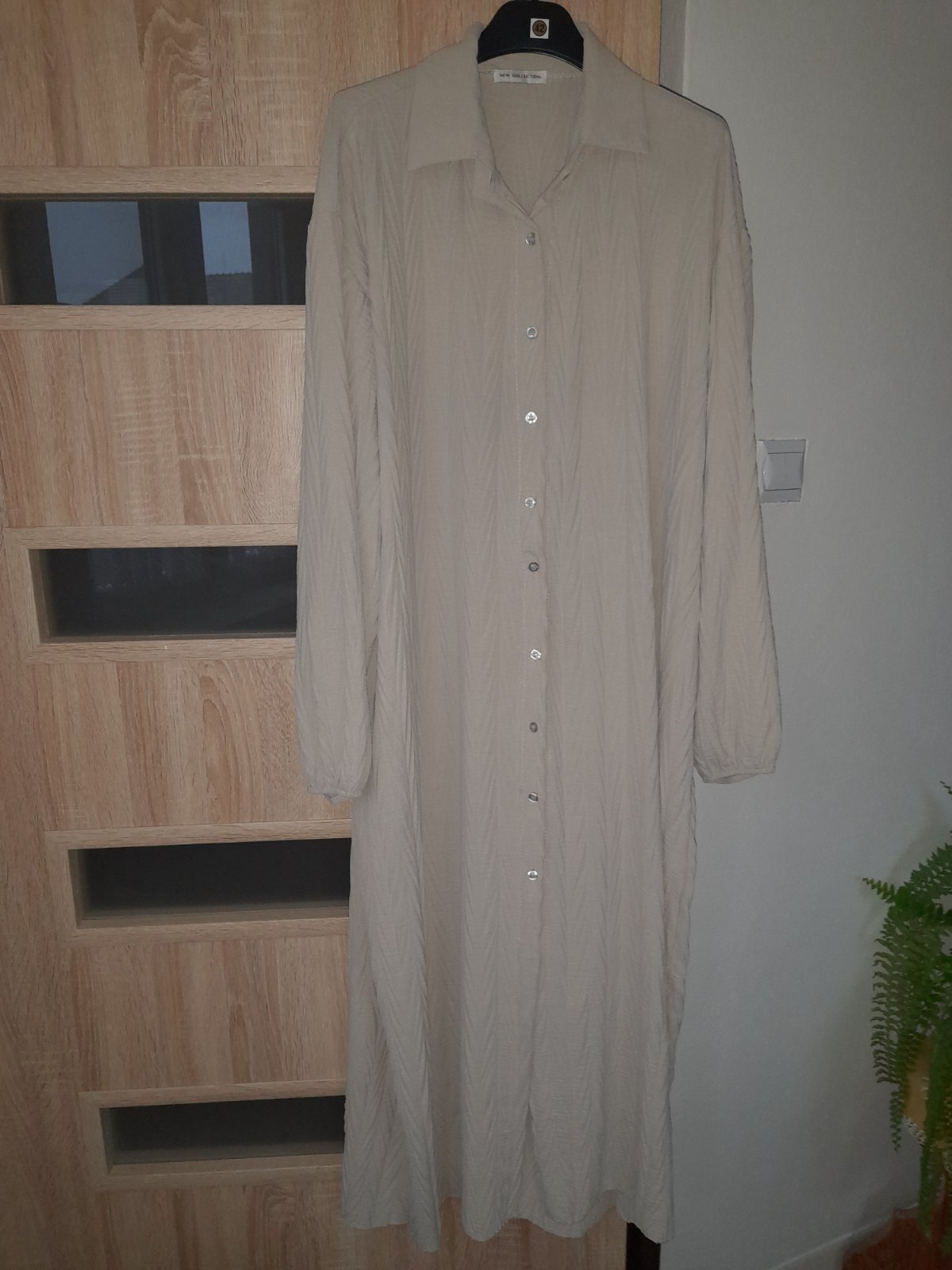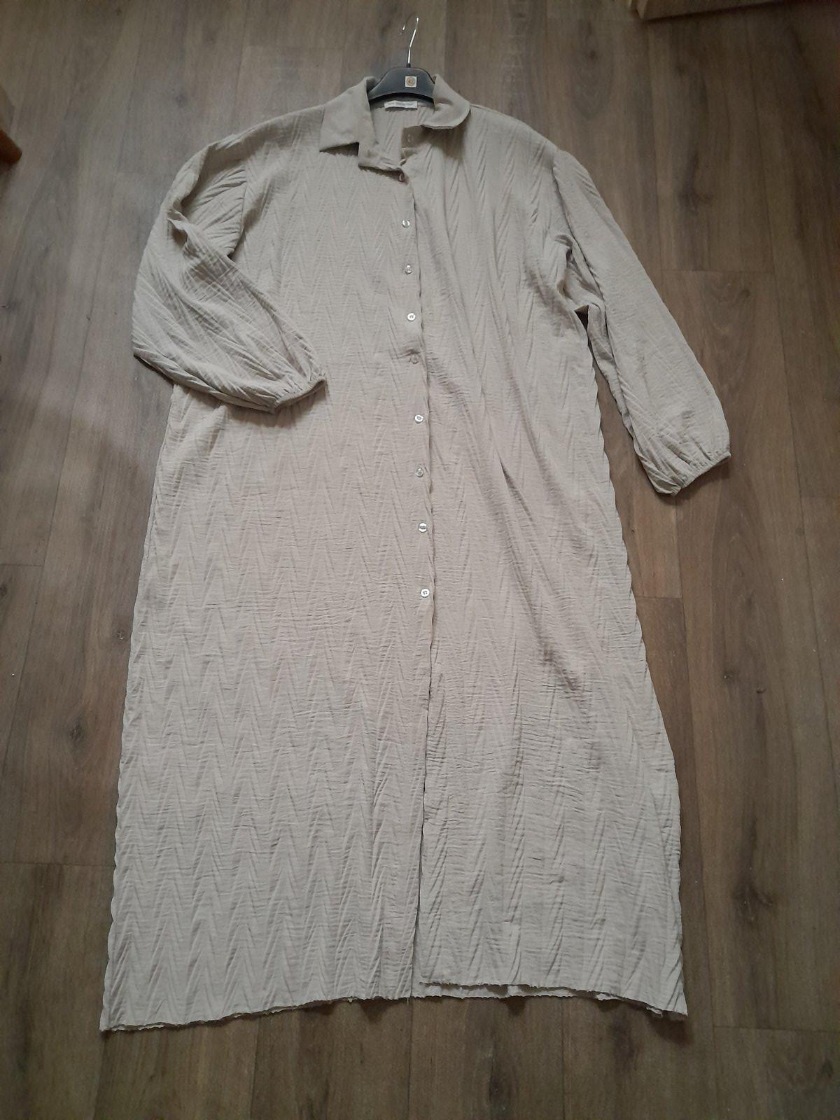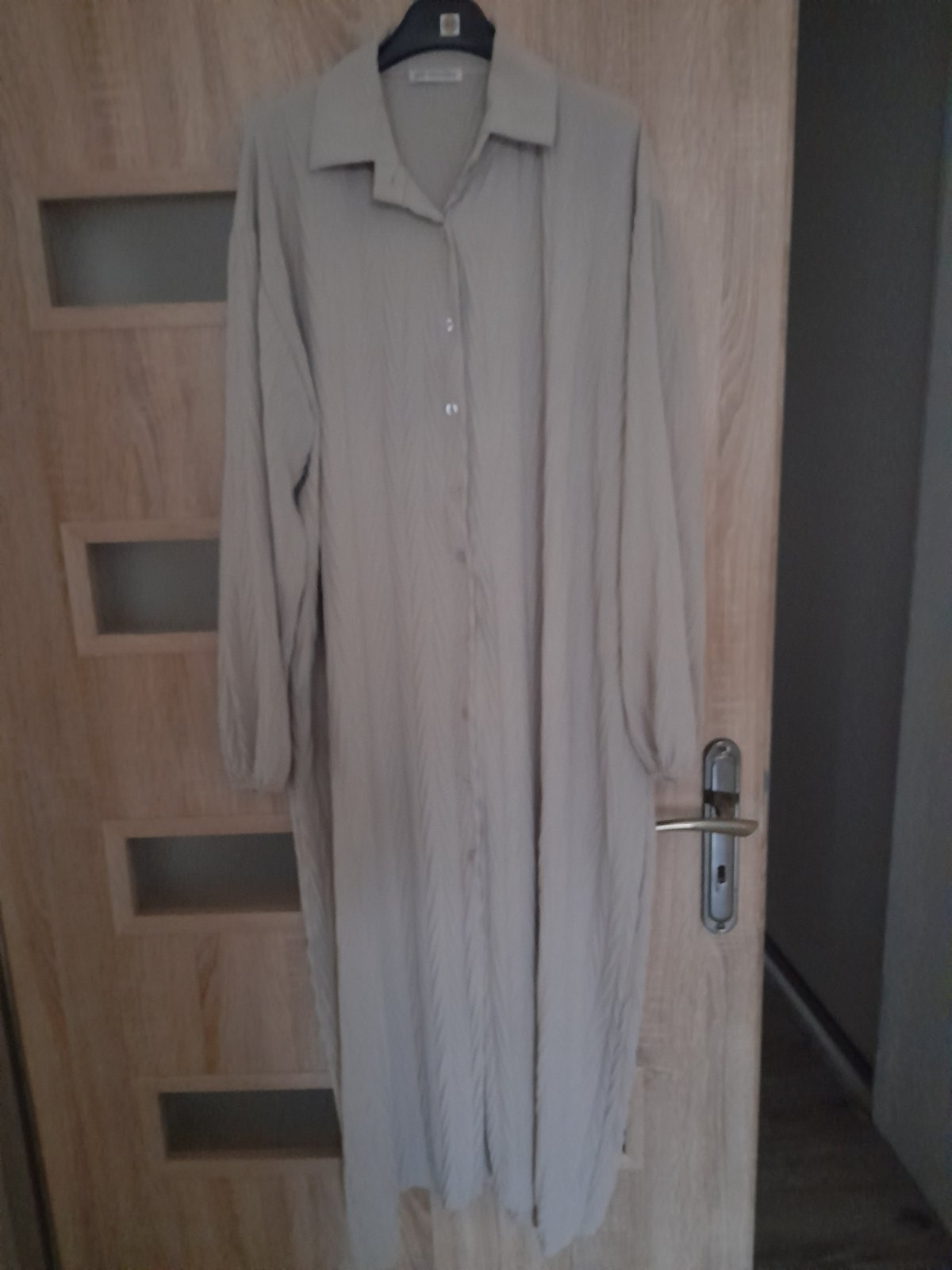 Predám pekne dlhé šaty,nosené,v super stave. Veľkosť nieje uvedená,odhadom L/xl. Je to voľný,oversize strih. Farba je bezova/ piesková.