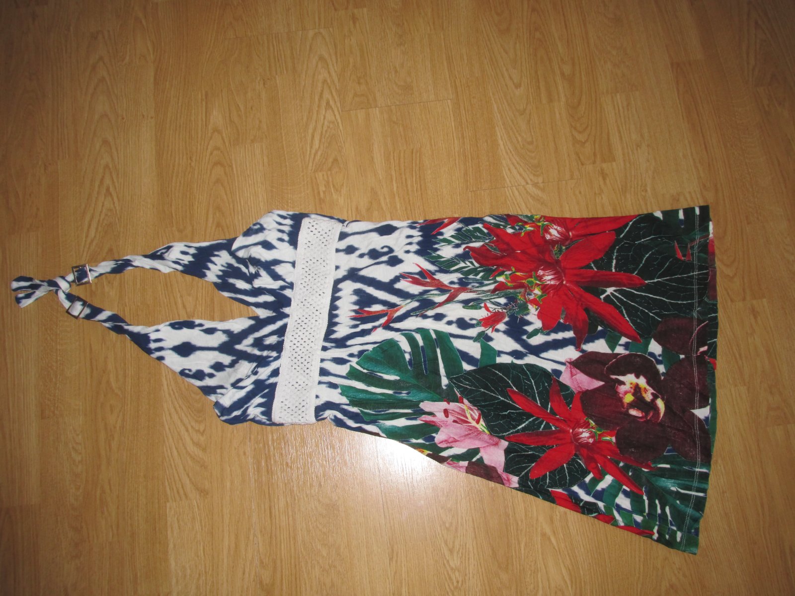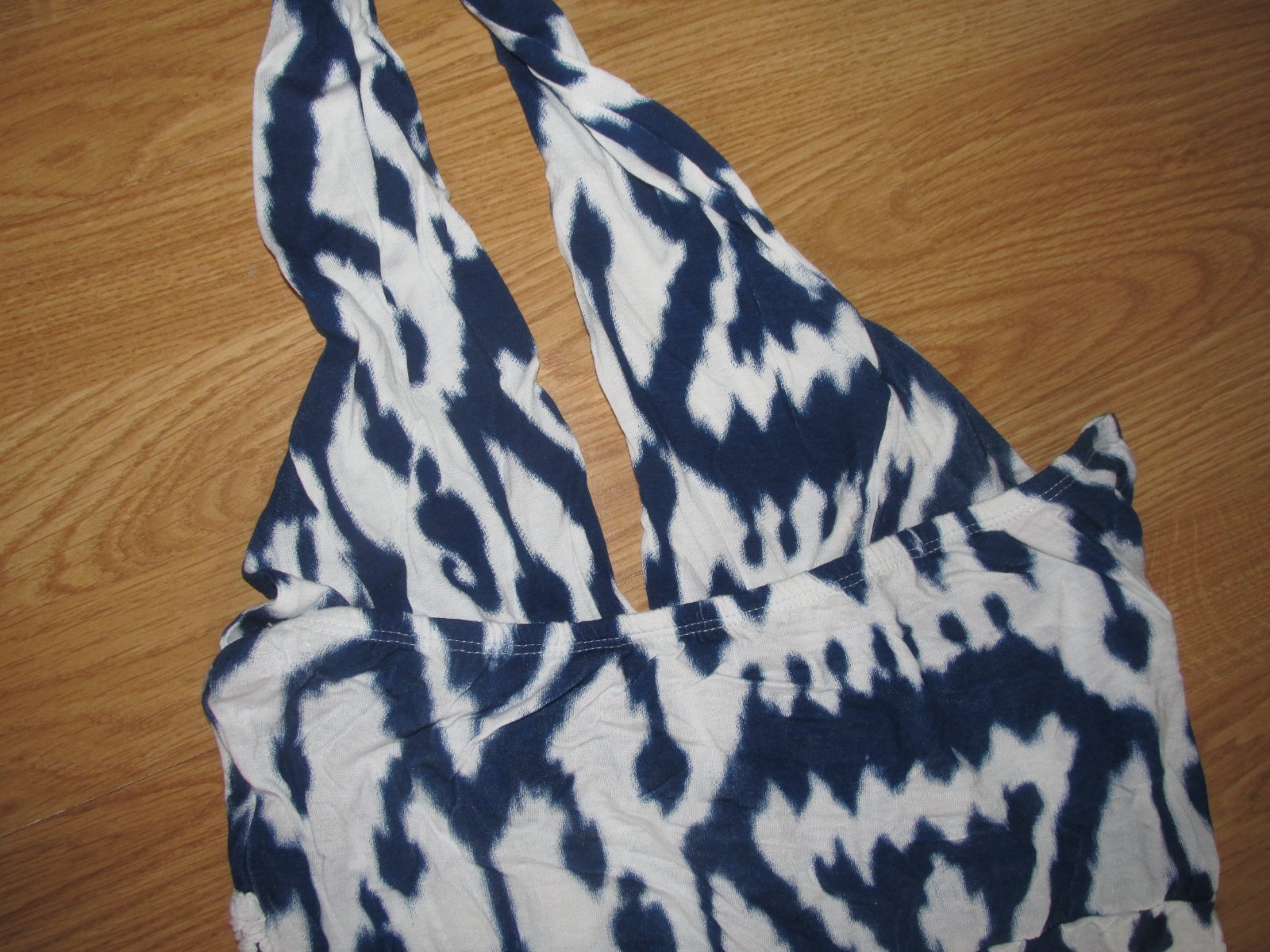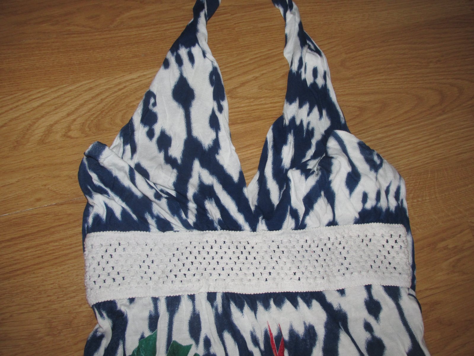 výborný stav šiat, zaväzujú sa za krkom, pod prsiami je madeirový ozdobný pás - je elastický s gumkou, v zadu na chrbáte je tiež gumička. Veľkosť písaná XL, ale odporúčam max. do veľ L.