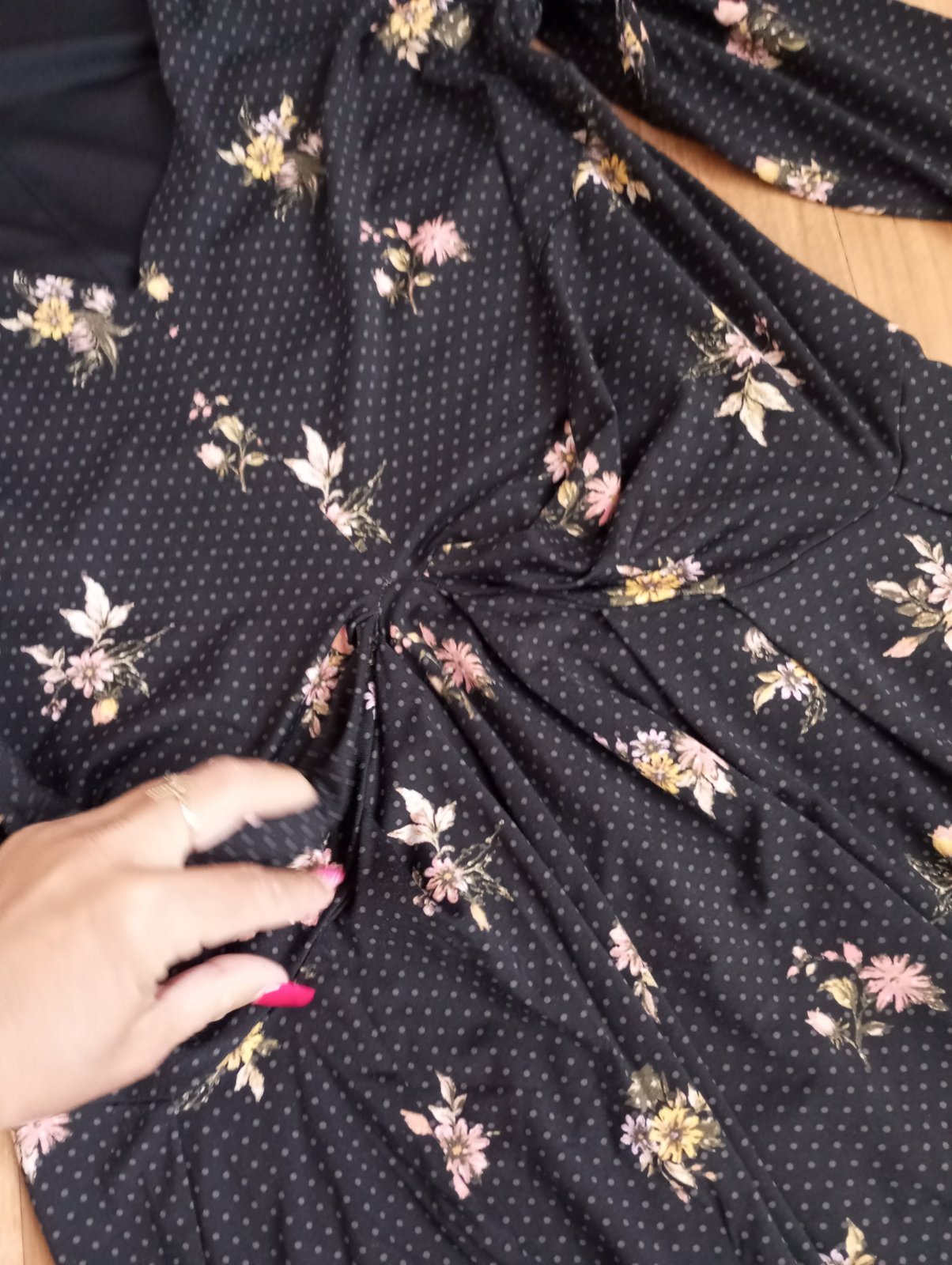 Dámske vzorované šaty so širokým rukávom a širokou gumou v páse. Výstrih do V. Maslové s čiernym vzorom. Vhodné na bežné nosenie aj na rôzne príležitosti. Elastické. Materiál: 100%polyester. Veľkos...