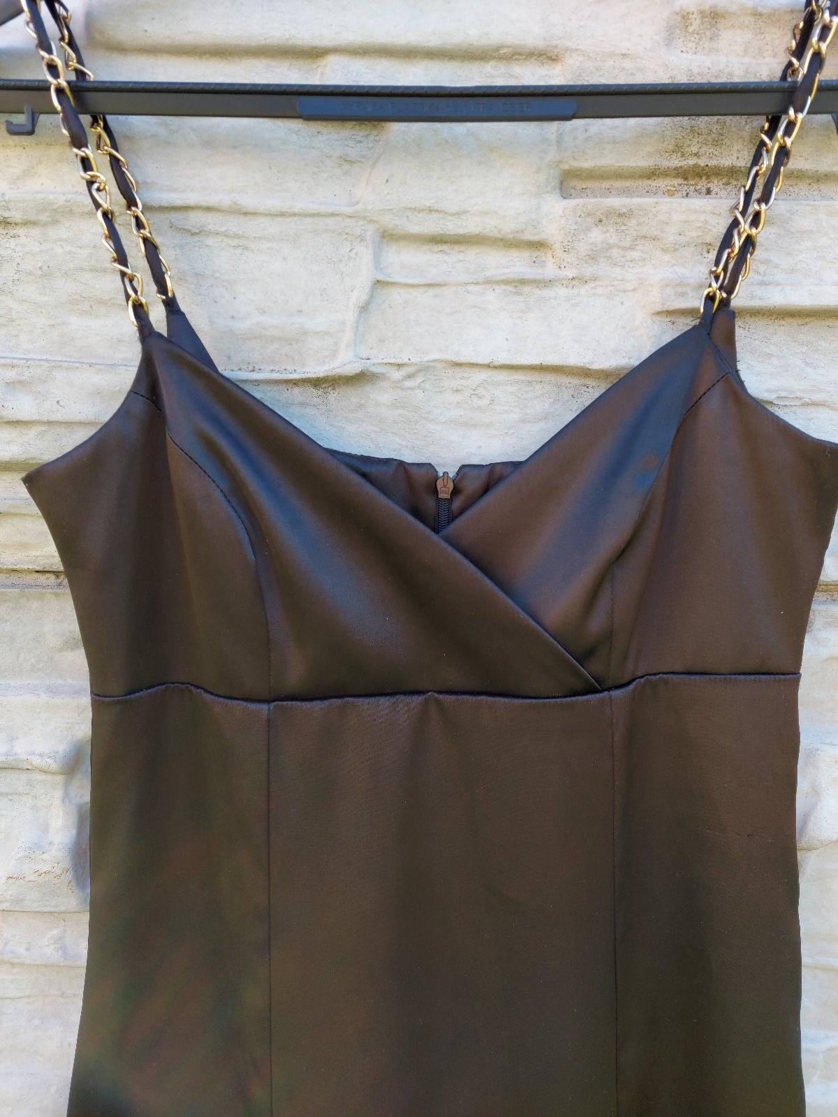 Dlhé čierne spločenské šaty, š. pod prsiami 35,5, dĺžka zadného dielu 125. Od pása sú šaty mierne do "Á-čka"-z 10 dielov, nie sú podšité. Na ramienkach je obmotaná zlaltá retiazka-viď foto. vzadu na chrbáte je zips. Materiál je na foto.