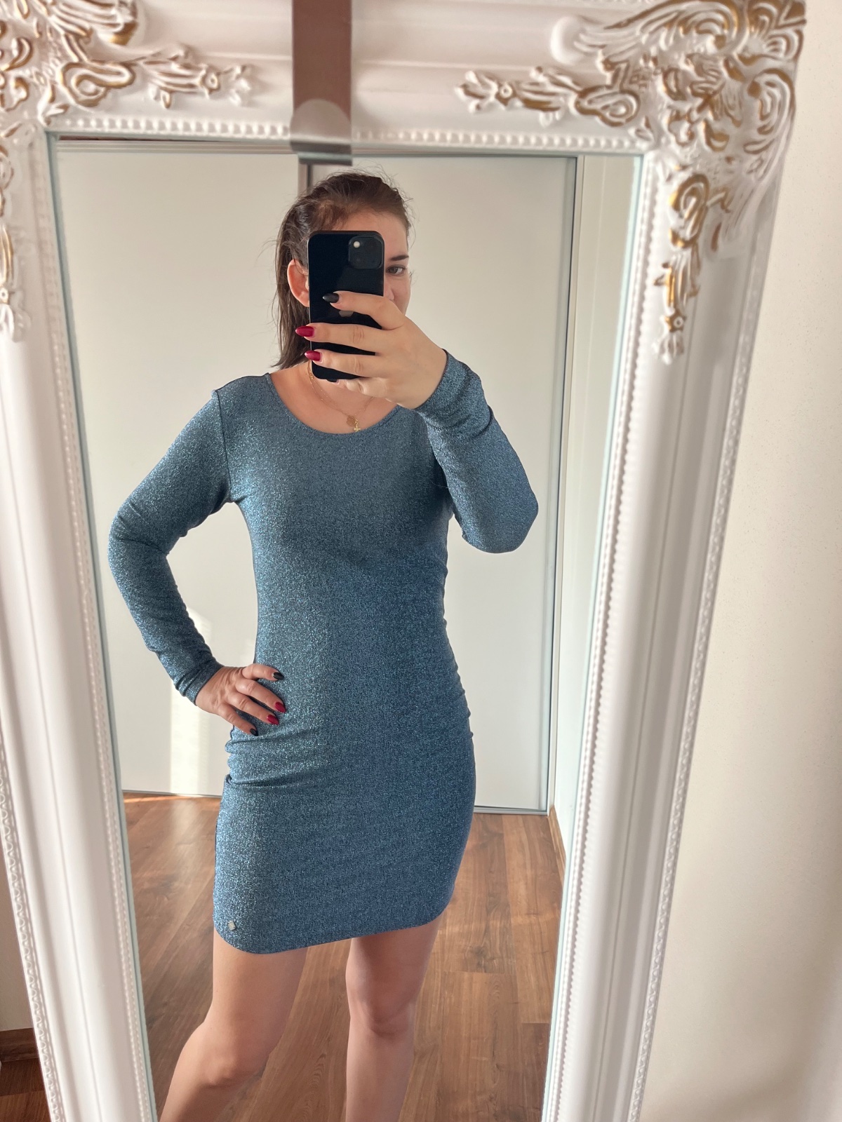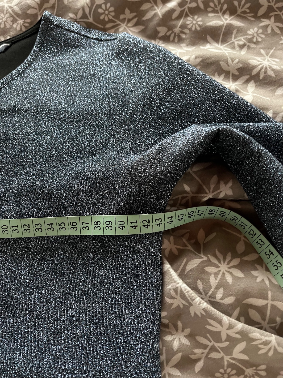 Veľkosť L, oblečené iba príležitostne. Pripájam medzi fotkami aj miery, ale zároveň aj svoje nakoľko šaty ešte povolia - môj obvod cez prsia 98 cm (merané s podprsenkou), výška 178 cm.