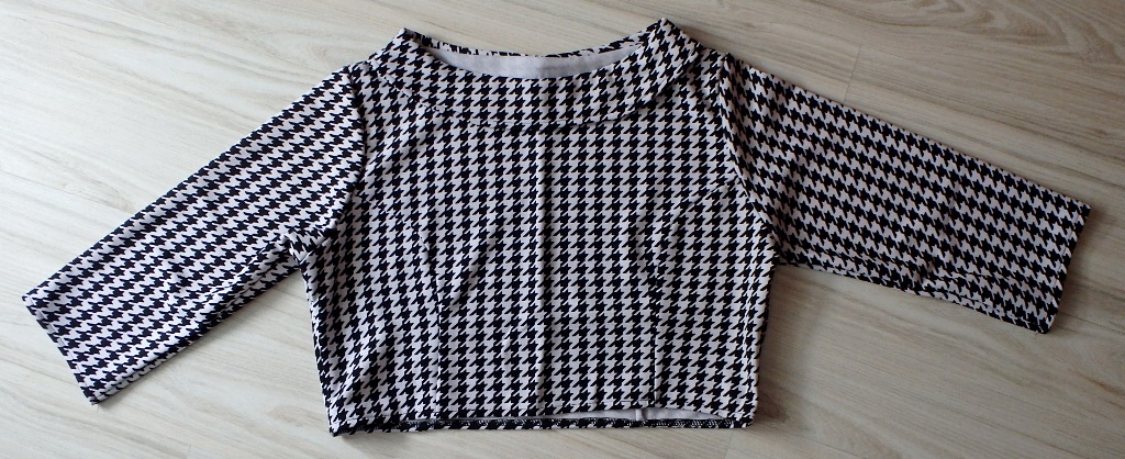 Crop top má pekný golierik do oblúka, trištvrťové rukáviky a vzor je taký istý ako vrchná časť šiat.