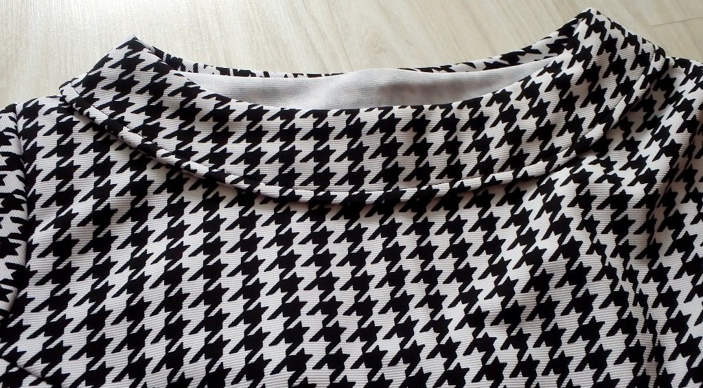 Vrchná časť šiat je čiernobiela so vzorom "kohútia stopa". Spodná časť je čierna.