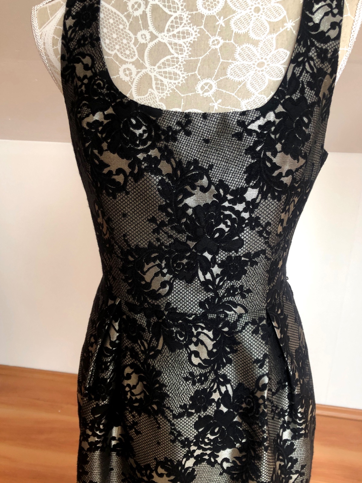Čierne čipkované šaty s bledým podkladom, takže čipka krásne vynikne a zároveň nepresvitá. Zapínajú sa na chrbte po dĺžke až do pása. Sú na hrubšie ramienka a v páse sú vytvarované, takže perfektne zdôraznia pás. Značka Oasis.