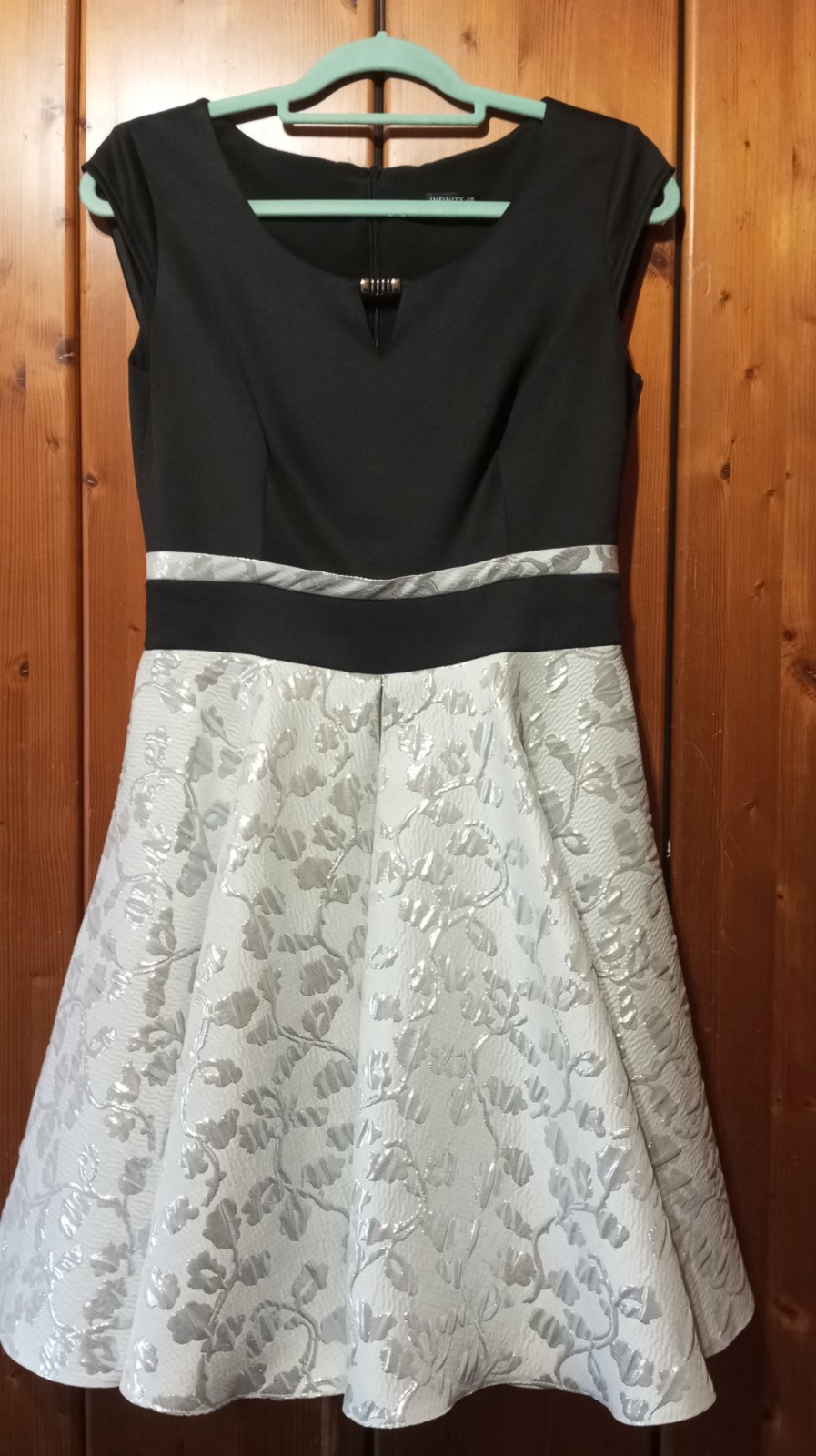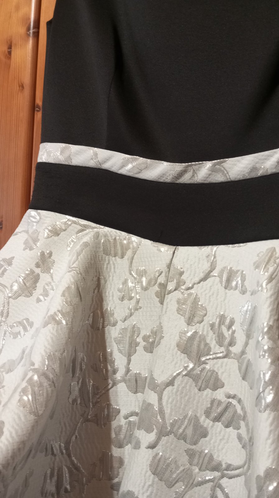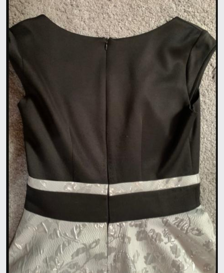 Predám spoločenské šaty /na ples, stužkovú, svadbu.../ striebornej farby v kombinácii s čiernou, v 100 % stave, nepoškodené, ako nové, 1x oblečené, vyčistené, dĺžka po kolená, na ramienka, veľkosť ...