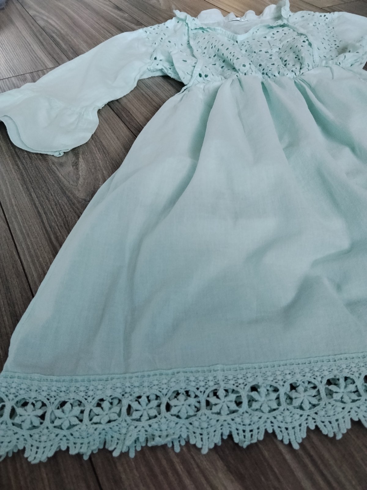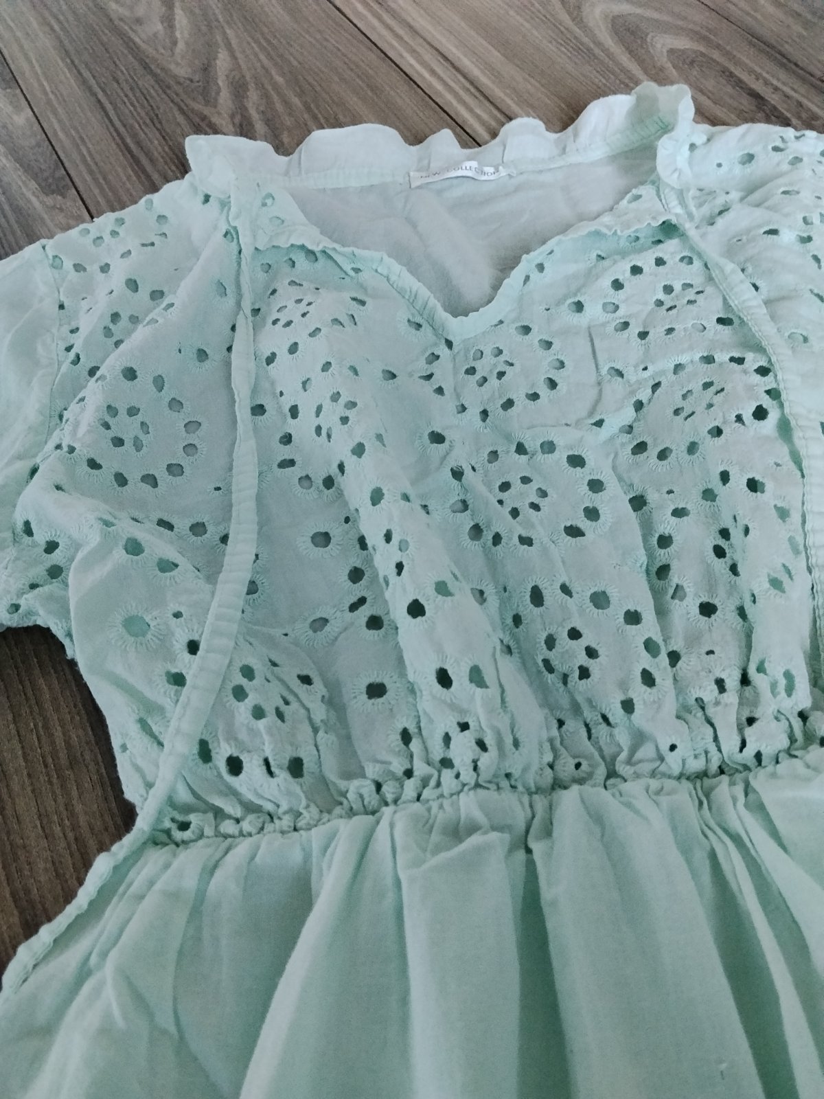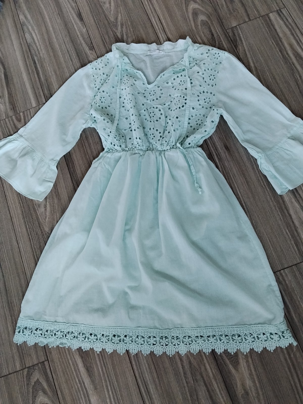 Ľahké madeirove šaty s bohatou sukňou, sukňa podsita. Drobné poškodenie na látke viď foto.