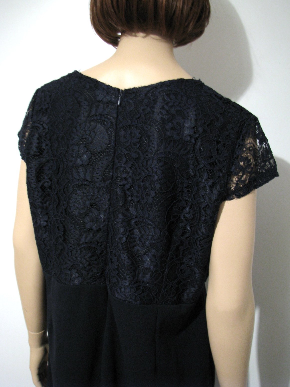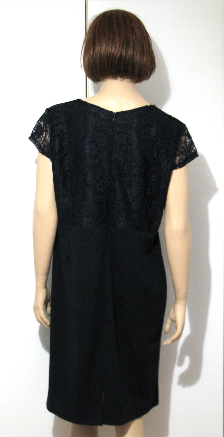 Elegantné jednoduché puzdrové šaty s krajkou v hornej časti, tmavomodrej farby. Na chrbte zips. Vhodné na rôzne príležitosti. Výborne zachovalé, bez poškodení. Veľkosť len odhadom XL až XXL, rozmery sú: šírka cez prsia 58 cm, šírka v páse 51 cm, šírka cca v bokoch 61 cm, celková dĺžka 102 cm. Materiál je aj trochu pružný, vedia sa prispôsobiť. Skôr na nižšiu postavu.