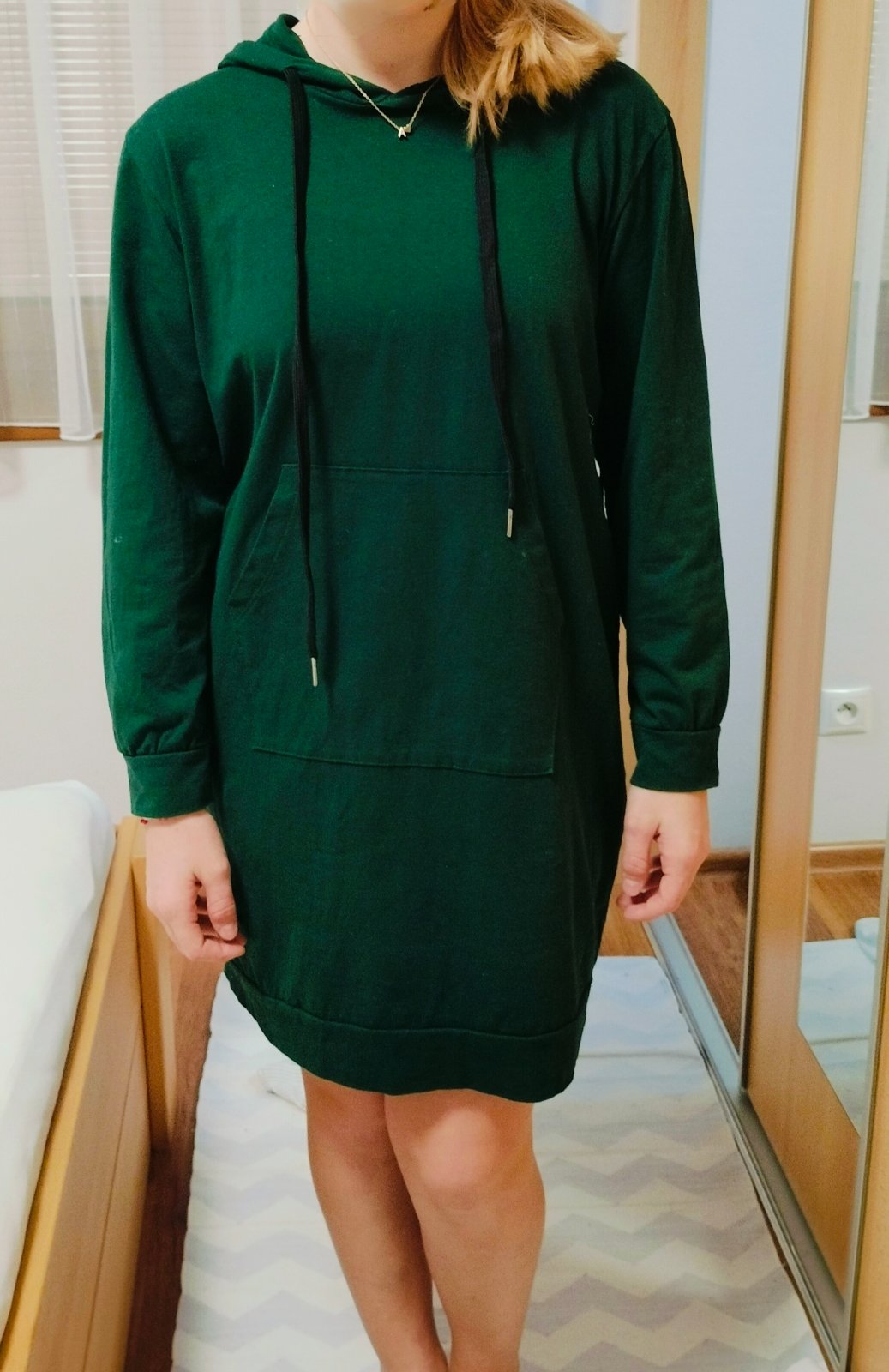 Ponúkam športove šaty, skoro nové, no žiaľ be výsačky. Sú s kapucňou plus funkčné vrecká. Farba flaškovo zelená, veľmi pekná ...na foto nevyzneje tak ......