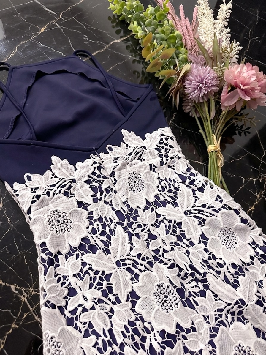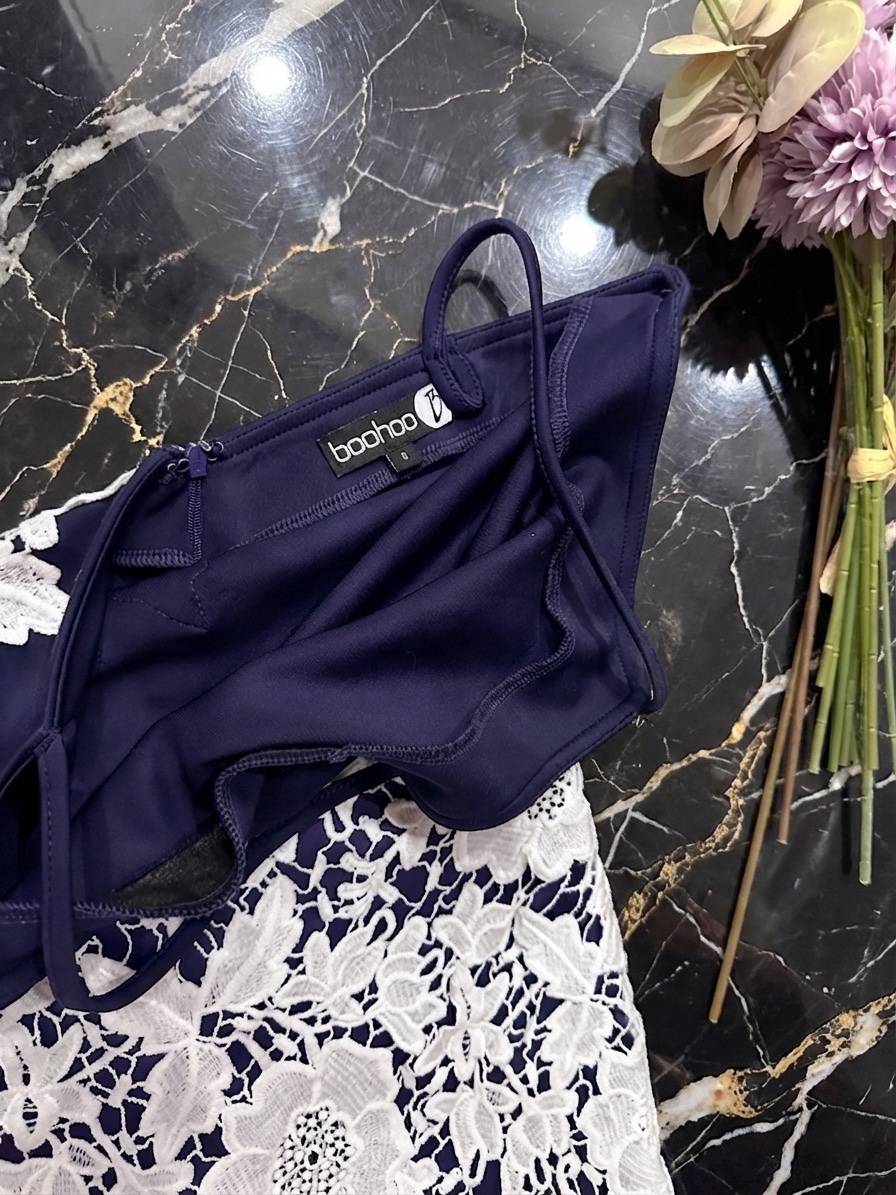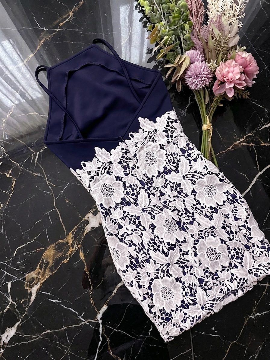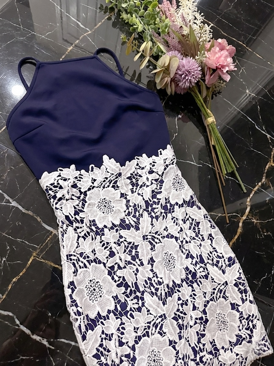 Elegantné šaty indigovo modrej farby, s bielou krajkou na vrchu, krásne sedia na postave, šaty sú elastické, boli použité 2x a vyčistené v čistiarni, sú v perfektnom stave. Sedia xs, menšie S.