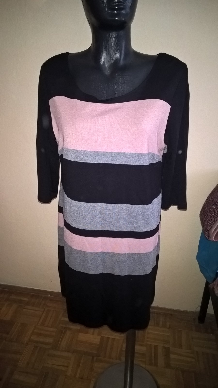 svetrové šaty po kolená 3/4 rukáv voľný strih farebná kombinácia čiernej šedej a starorúžovej bez poškodení