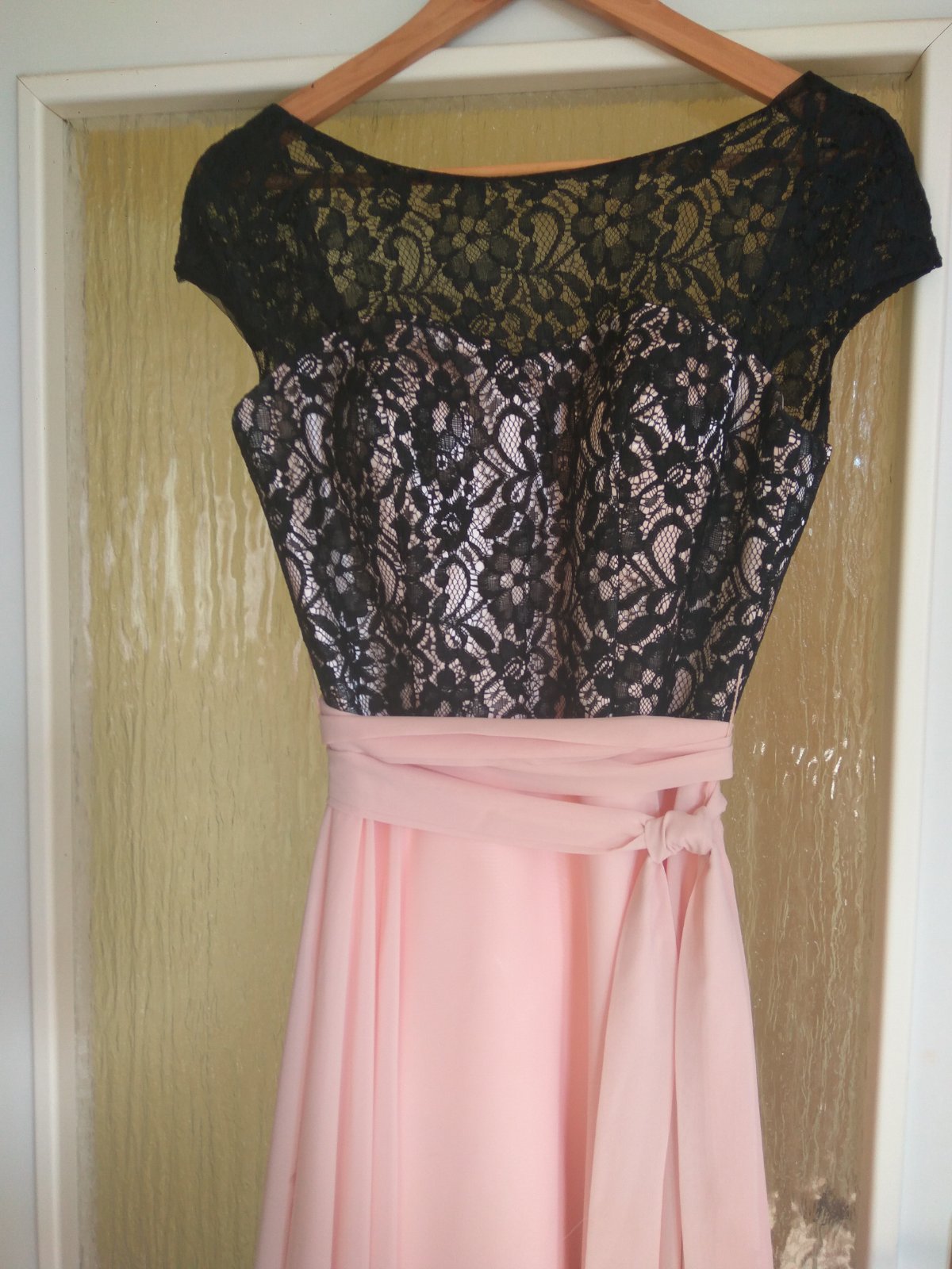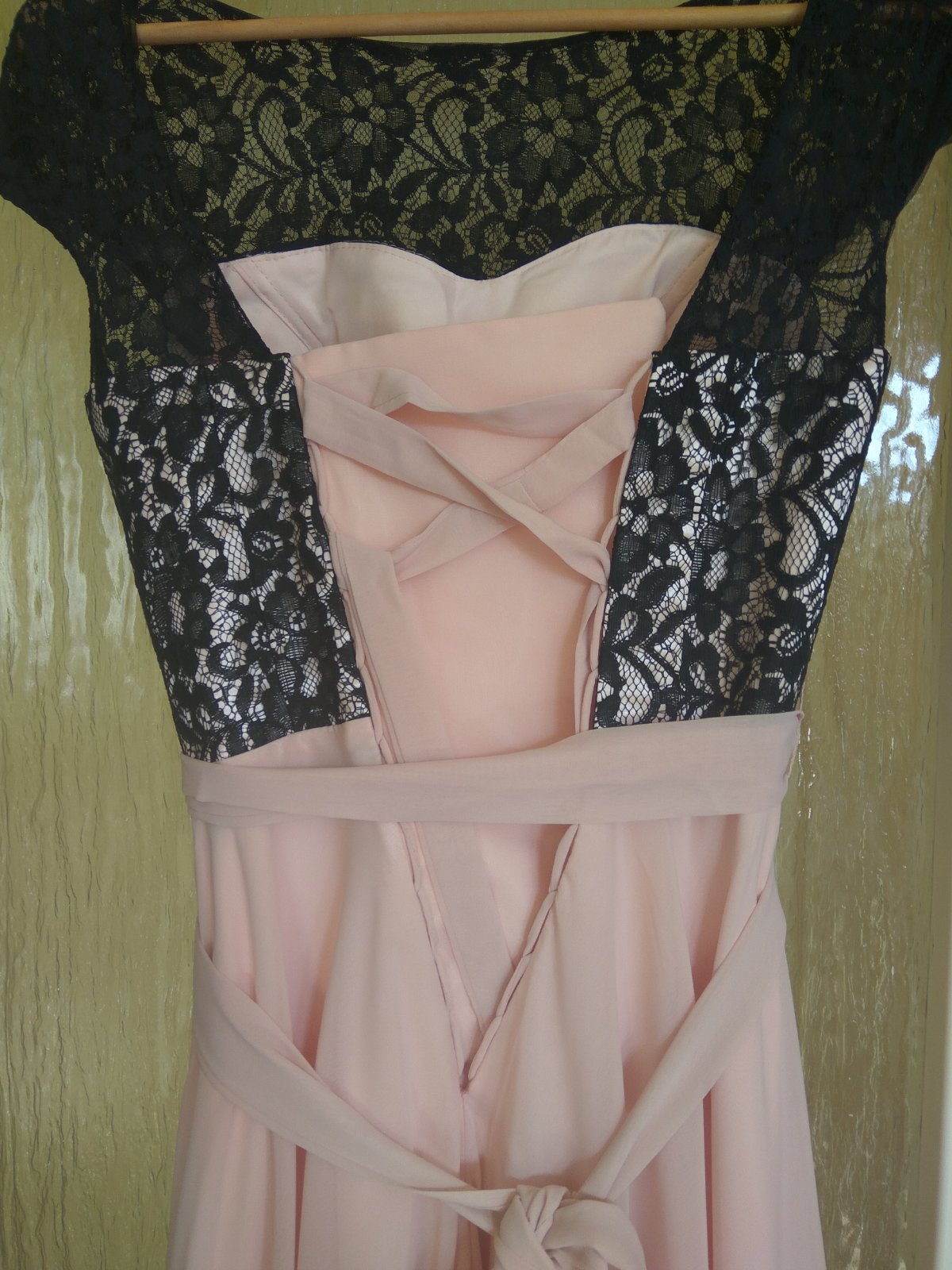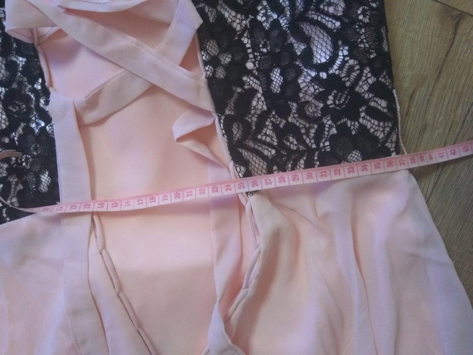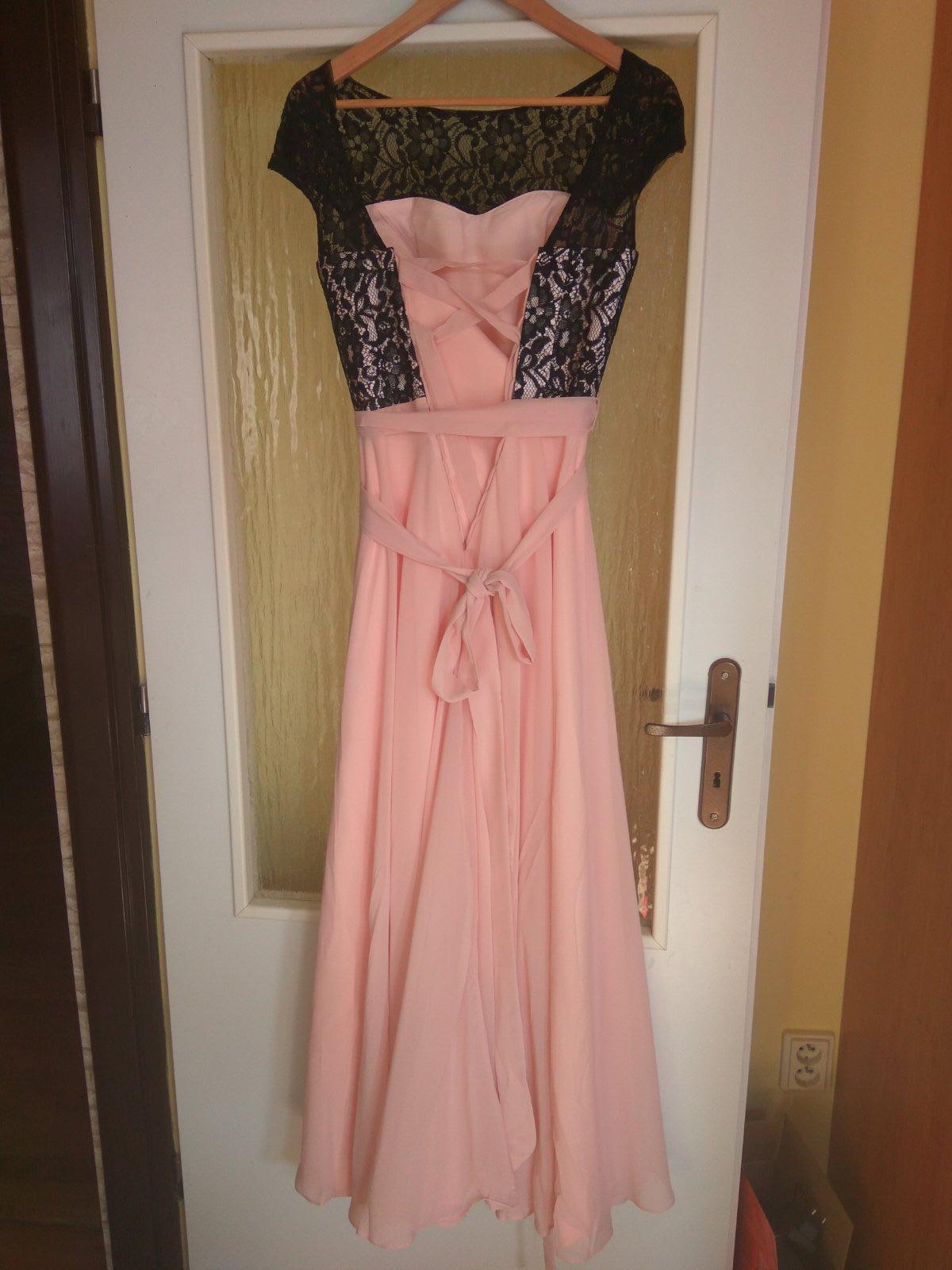 Dlhé spoločenské šaty na ples, svadbu, stužkovú. Oblečené 1x.Moja výška je 165 cm. Dĺžka: 146 cm, pás: 2 x 36 cm, plecia 46 cm. Vzadu sa uväzujú na šnurovanie čím sa zabezpečí stiahnutie alebo uvoľnenie. Okolo pása je opasok. Našivka vzadu má 15 cm, natoľko by sa dalo ešte šaty rozšíriť.