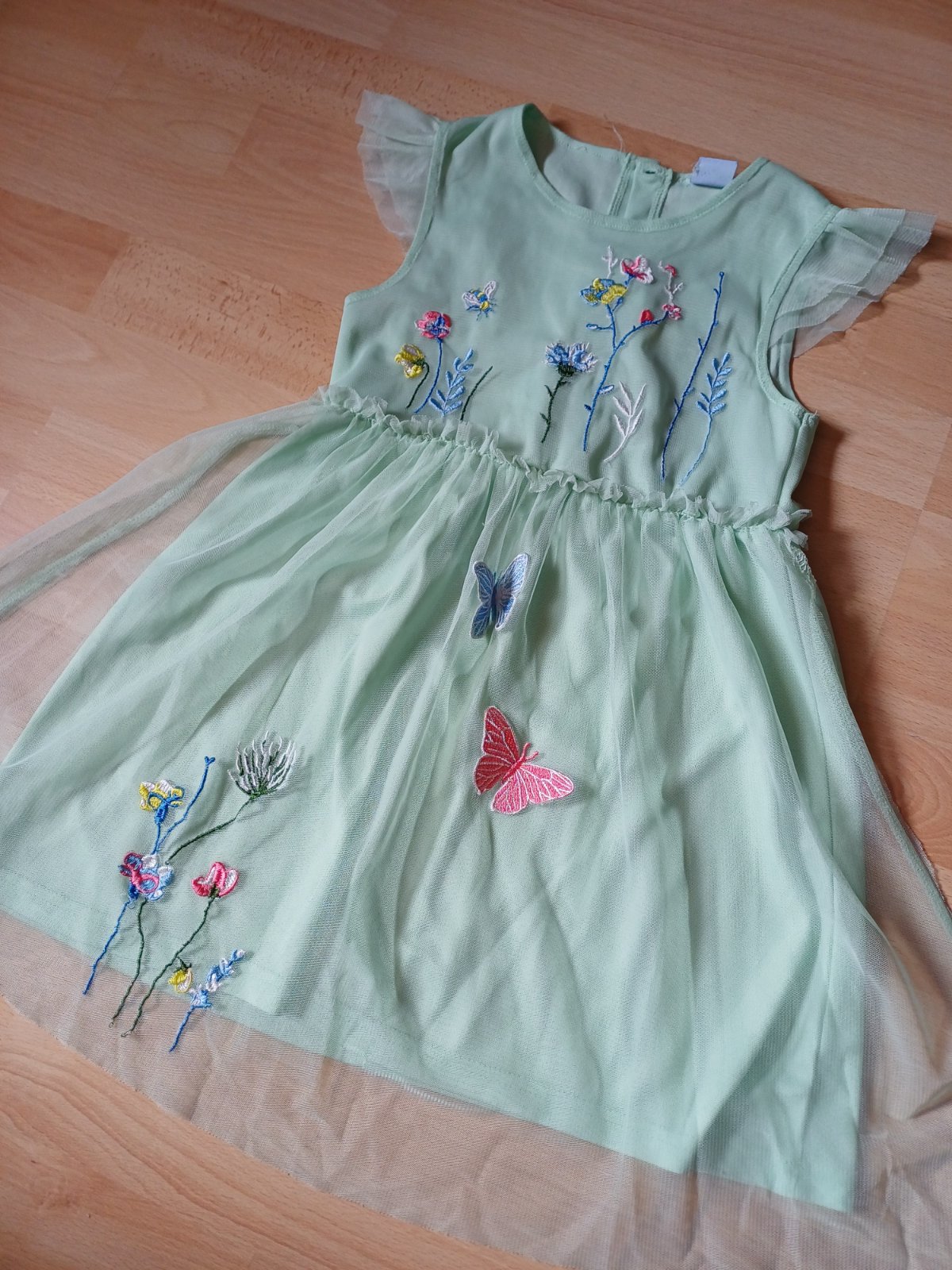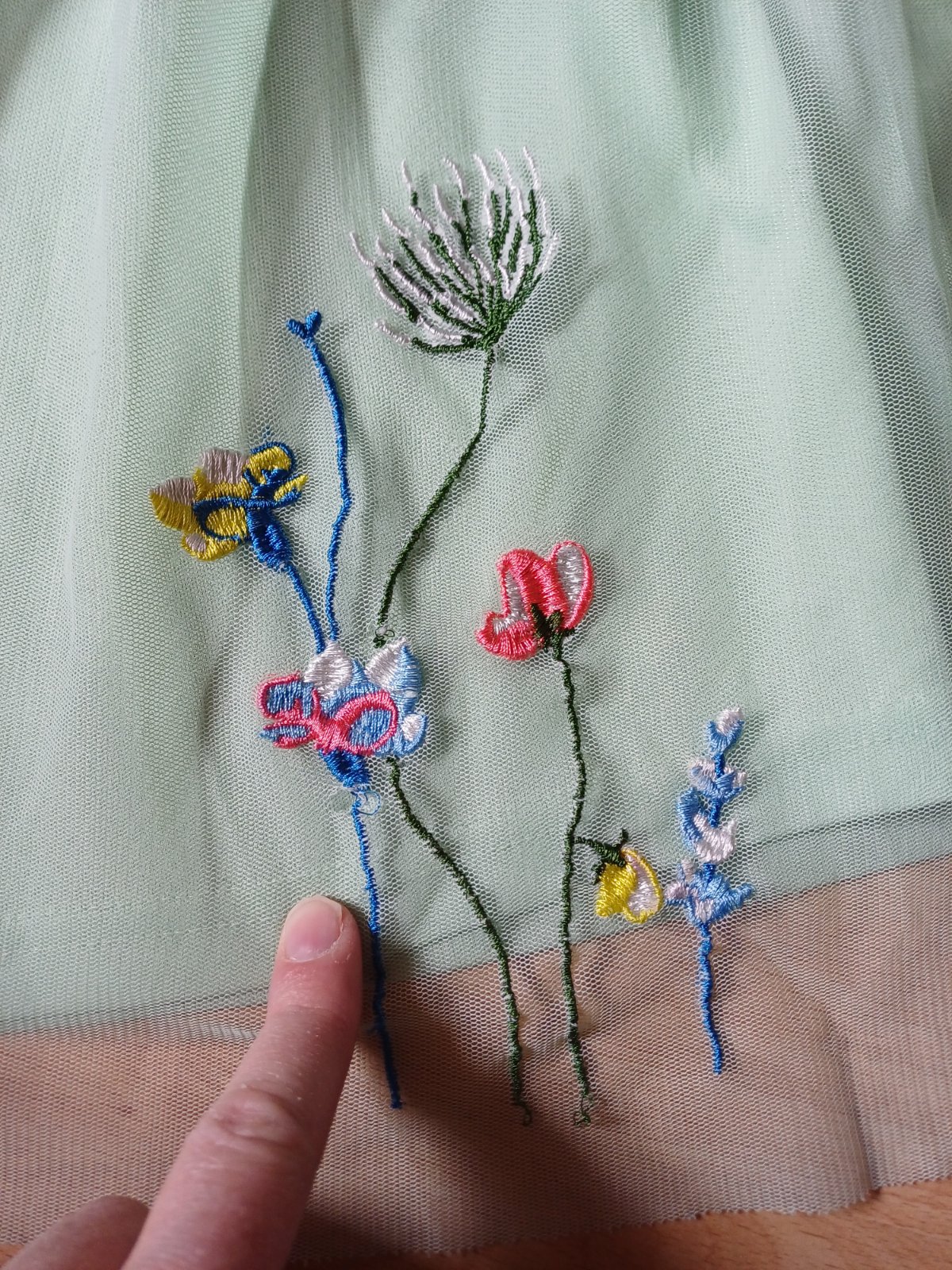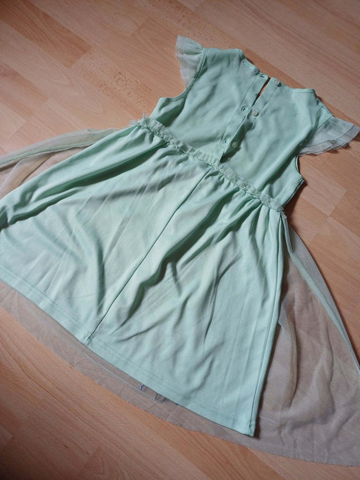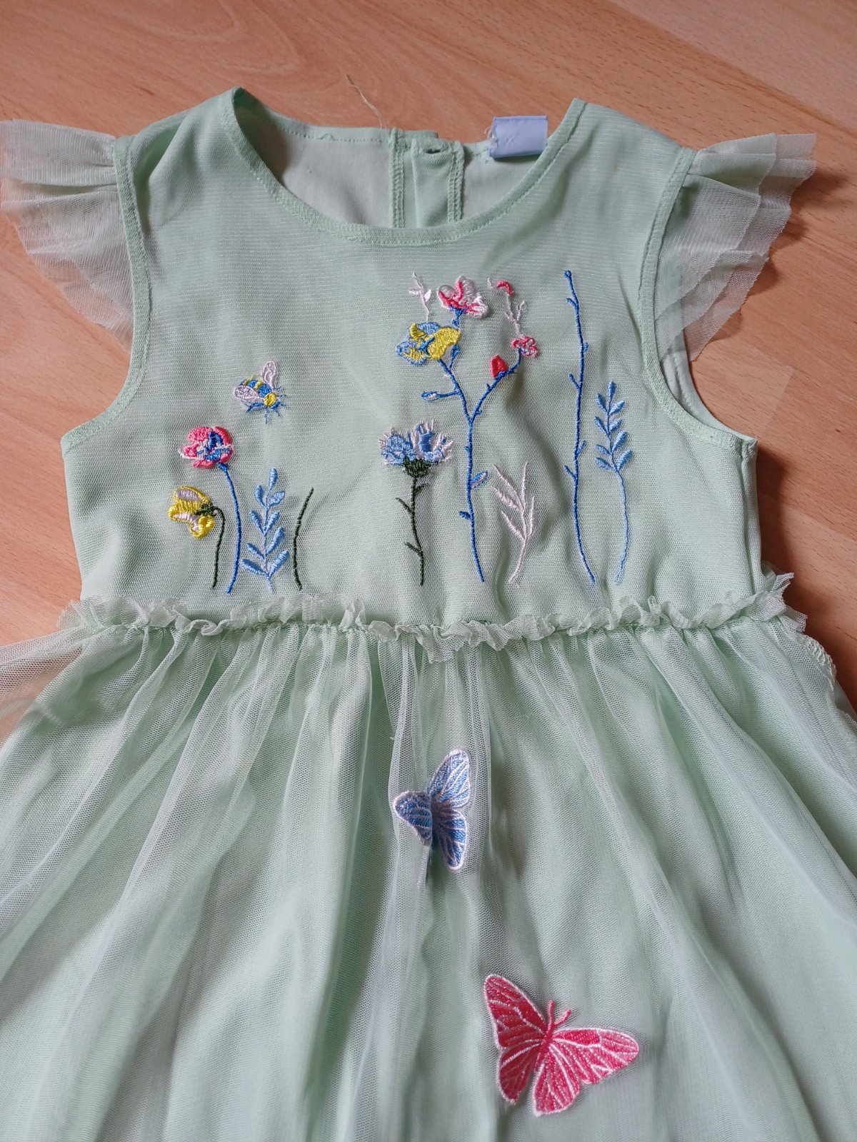 Šaty len tak na behačku na donosenie. Maju par jemnych zatiahnuti a jednu dierku pri kvetoch. Vzadu bez tylu