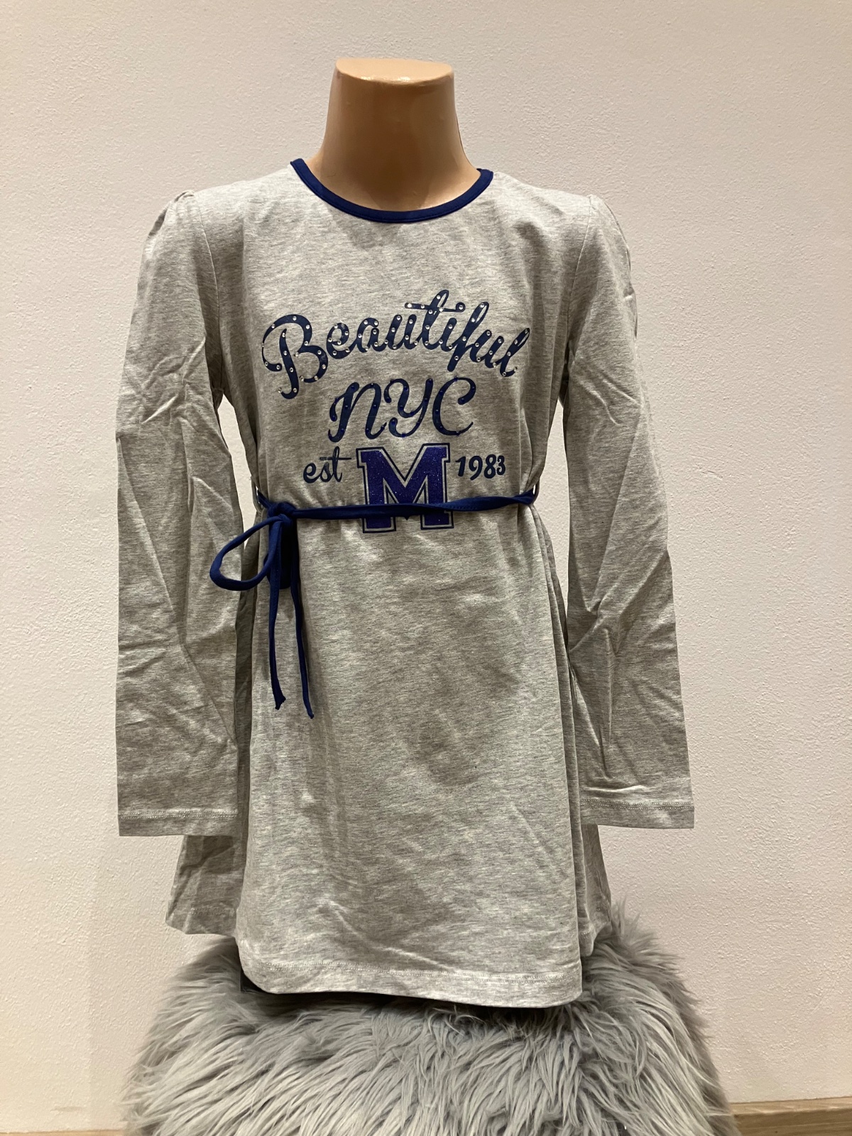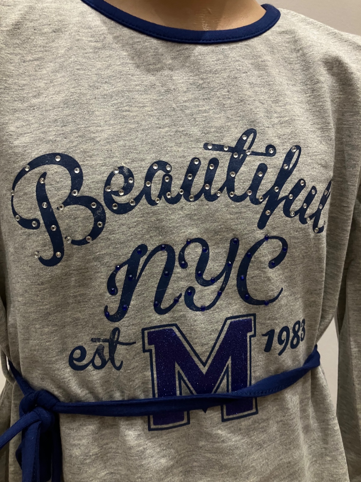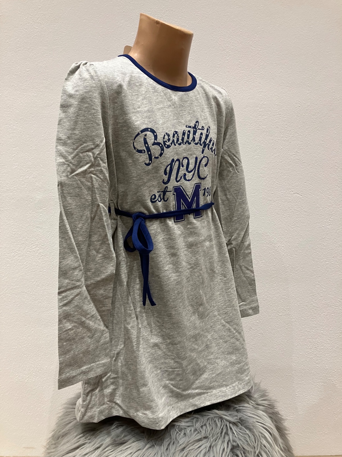 Dievčenské bavlnené šaty s dlhým rukávom. Tenké. Aplikácia s kamienkami, písmeno M je trblietavé. Áčkový strih. Materiál: 95%bavlna,5%elastan.