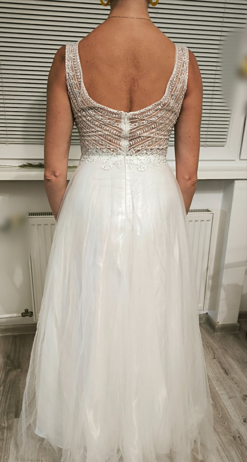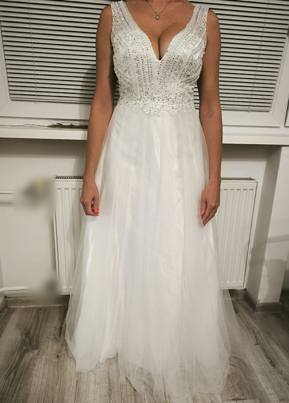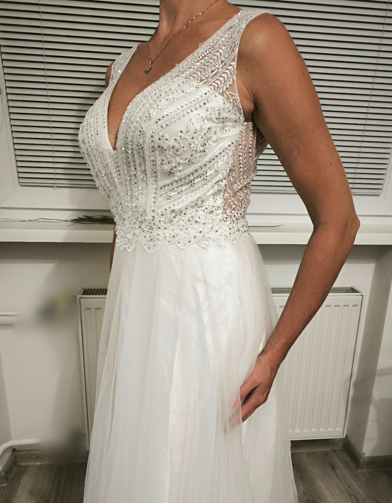 Svadobne saty, krasne flitrovane s cipkou. Sieťka bola odstránená a boli ešte vystuzene v prsiach. Po svadbe boli v čistiarni. Fotene na postave 176 cm.