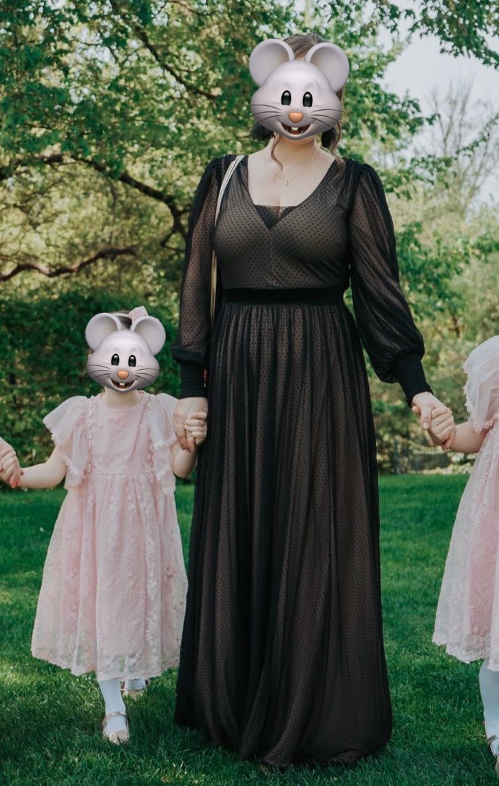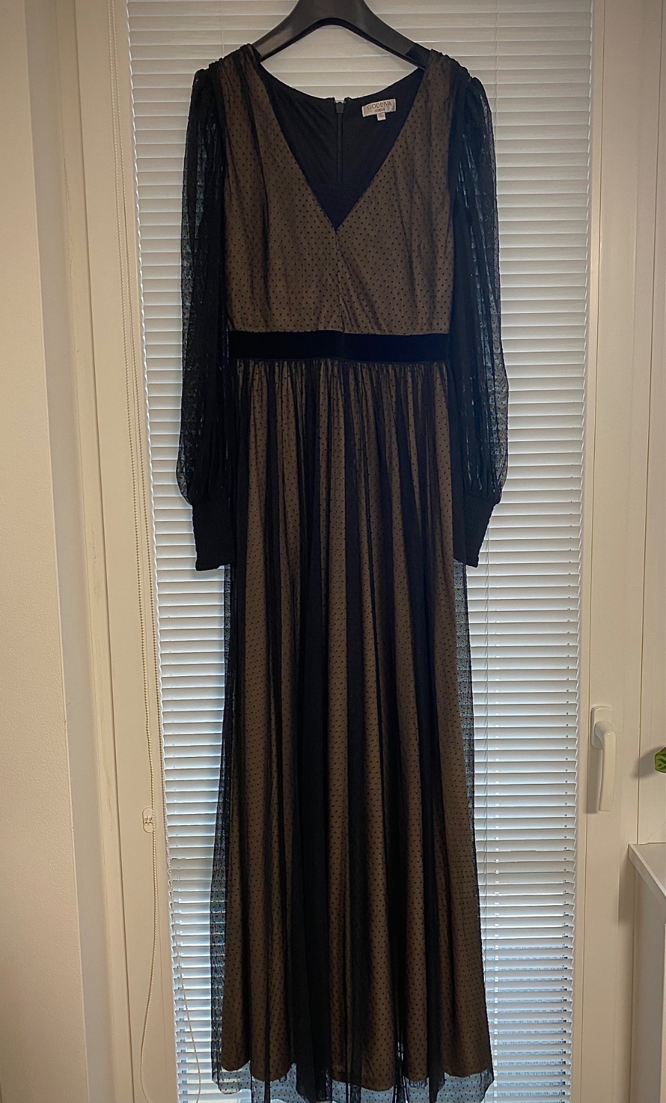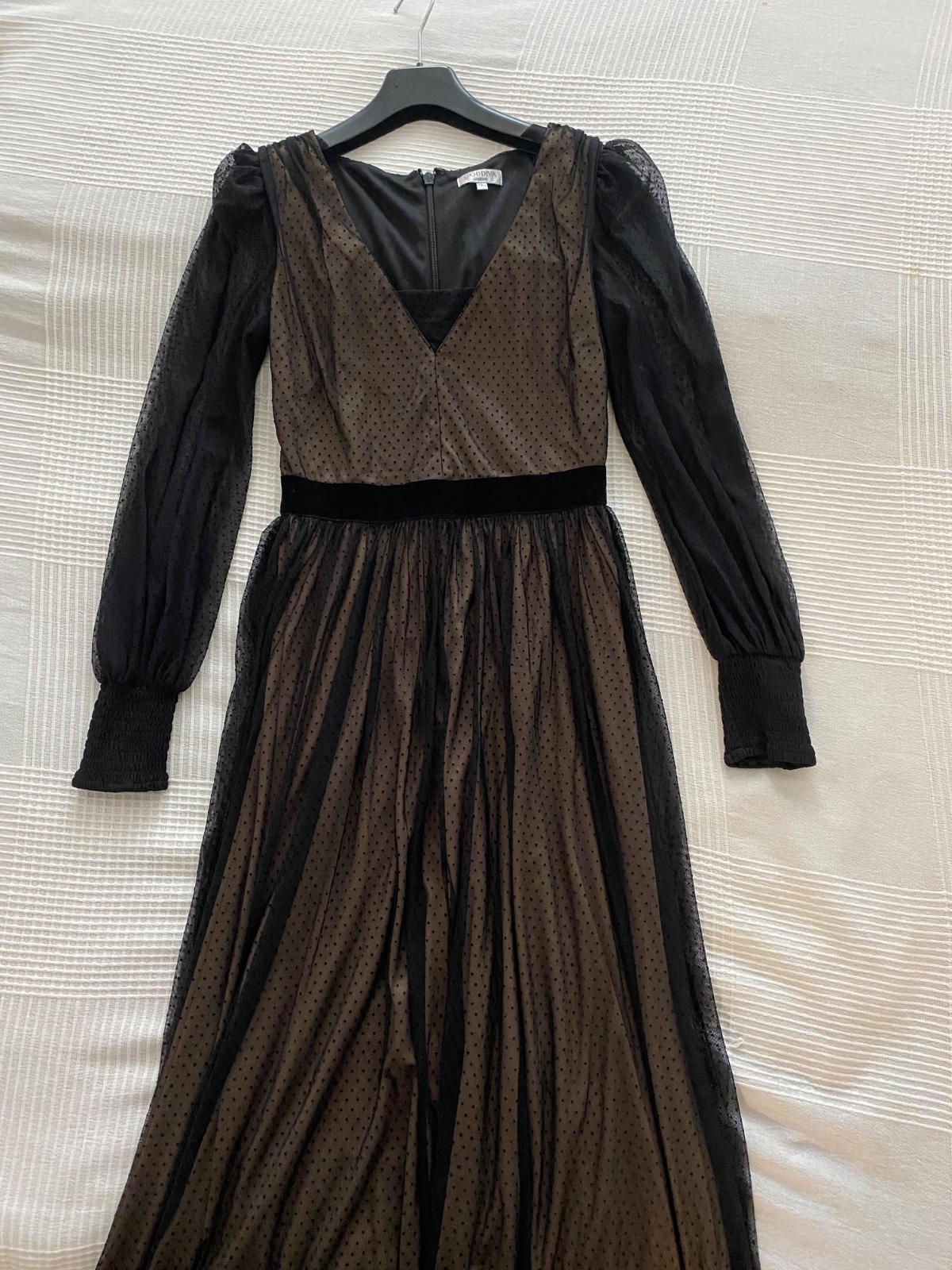 Krásne šaty oblečené 1x. Podšívka je béžovej farby a vrchný tyl čierna s bodkami. Rukávy priehľadné. Vzadu na zips….upravená dĺžka na 164cm + 10 cm opätok. Je to anglická značka žiadna čína. Sú ľahké, vzdušné, pohodlné.